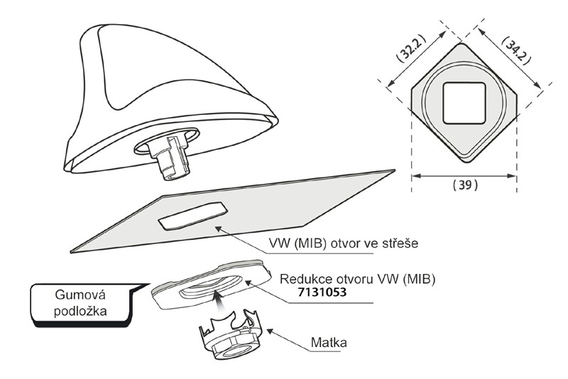 Určené pre automobily s anténou umiestnenou v zadnej časti strechy s otvorom 32,2 x 34,2 x hĺbka 39 mm.