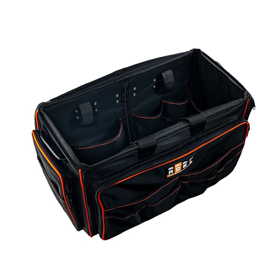 Veľká detailingová taška zo 100% polyesteru. Ľahko pojme všetko, čo môže byť pri práci potrebné. Zosilnený chrbát navyše ochráni nástroje počas prepravy a sklopná rukoväť spolu s pevnými kolesami vám uľahčí premiestňovanie. Rozmery: 70 x 40 x 40 cm.