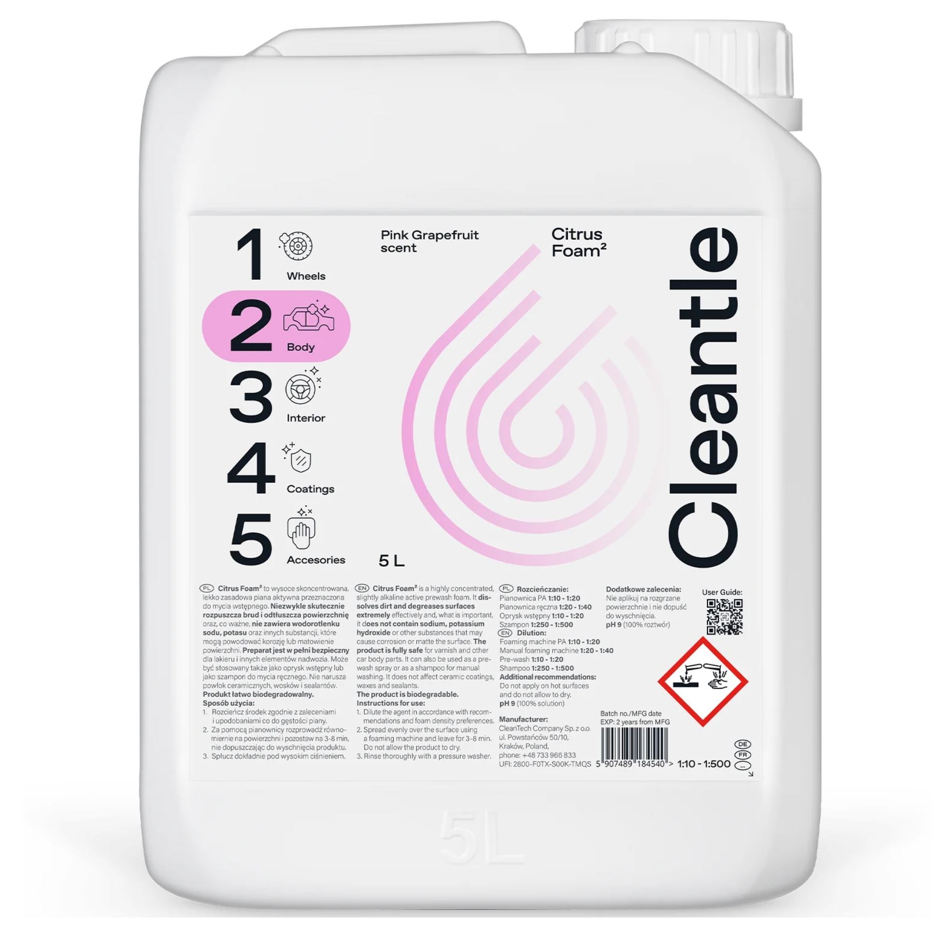 Cleantle Citrus Foam² je vysoko koncentrovaná, mierne alkalická aktívna pena určená na predumytie. Účinne rozpúšťa nečistoty a odmasťuje povrch. Výrobok neobsahuje hydroxid sodný, draslík a ďalšie látky, ktoré môžu spôsobiť koróziu alebo matovanie povrchu. Vďaka tomu je táto aktívna pena úplne bezpečná pre lak a ďalšie časti karosérie. Prípravok je možné použiť aj ako predumytie a nie je škodlivý pre pokožku rúk. Nenarušuje keramické povlaky, vosky ani sealanty. Pri práci vás poteší vôňou ružového grepu.