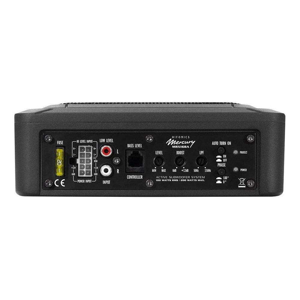 Podsedlový aktívny subwoofer MERCURY MRX168A s rozmermi 26 x 19,5 cm podkopáva konvenčné subwooferové systémy tohto typu o niekoľko centimetrov. To, čo malý aktívny systém produkuje v oblasti mohutných basov, zaručene ohromí každého poslucháča. V takých malých puzdrách je počas prevádzky veľmi vysoký tlak; komerčné membrány by preto boli zničené. Z tohto dôvodu používa MRX168A špeciálnu hliníkovú membránu oválneho tvaru, ktorá odolá aj tým najvyšším tlakom. Nemalý je aj použitý zosilňovač triedy A/B. So 100 wattmi RMS dokonale napája hliníkový kužeľový woofer cez 36mm kmitaciu cievku. Vďaka 10pinovému konektoru, odolnému proti skratu, je možné v prípade potreby tiež rýchlo a ľahko vybrať aktívny systém.