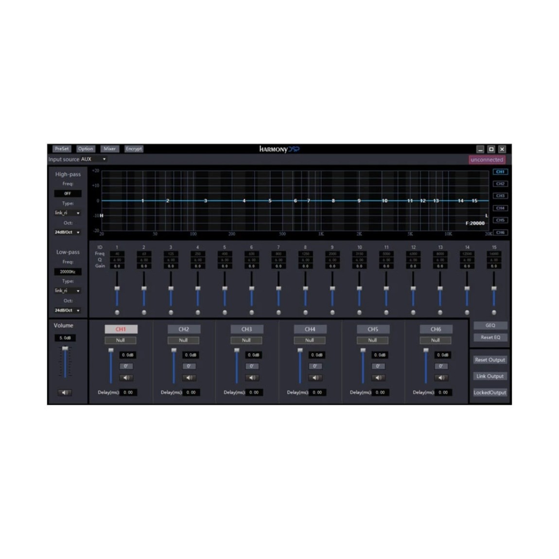 - Nastavenie pásmových priepustí, časových korekcií alebo detailného ekvalizéra.