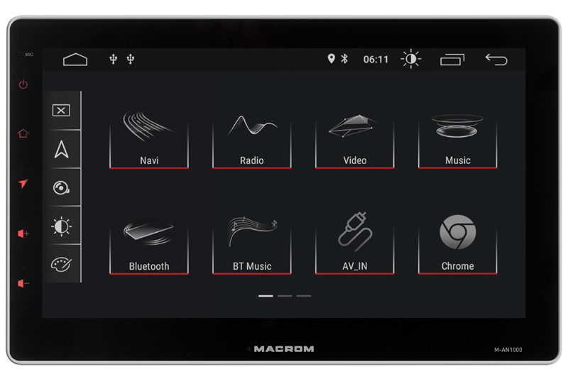 Multimediálny prehrávač s 10,1" kapacitným displejom, 2DIN telo prístroja, operačný systém Android Oreo 8.1. Macrom M-AN1000 je multimediálna jednotka s operačným systémom Android. 2DIN veľkosť a 10,1" kapacitný displej vo forme tabletu, umožňuje inštaláciu do radu automobilov, kam doteraz nebolo možné inštalovať jednotku s touto veľkosťou monitora. Prístroj je vybavený zosilňovačom 4 x 45 W, AM / FM tunerom, Bluetooth handsfree sadou s podporou streamovania hudby, tromi zadnými USB konektormi, mikro SD kartou, vstupom pre zadnú a prednú parkovaciu kameru, integrovaným GPS prijímačom, Wifi. Operačný systém Android Oreo 8.1 umožňuje používať prístroj rovnako, ako by ste používali smartphone alebo tablet. Môžete čítať e-maily, vyhľadávať informácie na internete, prehrávať hudbu alebo videá na YouTube, kontrolovať svoje e-maily, inštalovať obľúbené aplikácie a mnoho ďalších funkcií.