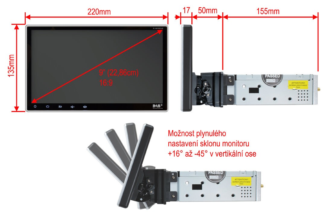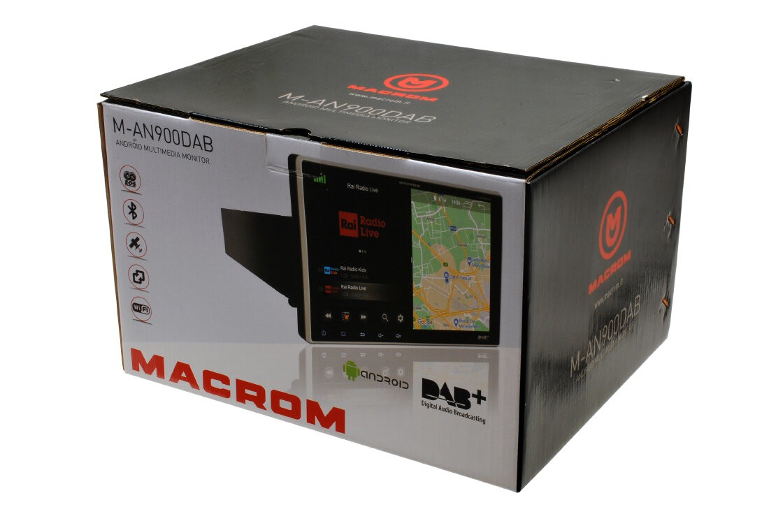 Macrom M-AN900DAB je multimediálna jednotka s operačným systémom Android a zabudovaným tunerom DAB. Veľkosť 1DIN a 9" kapacitný displej vo forme tabletu umožňujú inštaláciu do celého radu vozidiel, kde doteraz nebolo možné inštalovať jednotku s takouto veľkosťou monitora. Jednotka je vybavená zosilňovačom s výkonom 4 x 45 W, tunerom AM/FM/DAB, súpravou hands-free Bluetooth s podporou streamovania hudby, tromi zadnými konektormi USB, vstupom pre zadnú a prednú parkovaciu kameru, integrovaným prijímačom GPS, WIFI. Operačný systém Android Oreo 8.1, umožňuje používať zariadenie rovnako ako smartfón alebo tablet. Môžete čítať e-maily, vyhľadávať informácie na internete, prehrávať hudbu alebo videá na YouTube, kontrolovať e-maily, inštalovať obľúbené aplikácie a mnoho ďalších funkcií.
