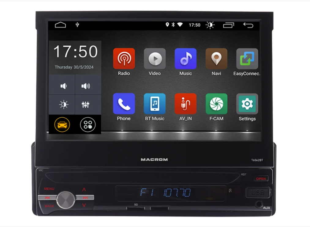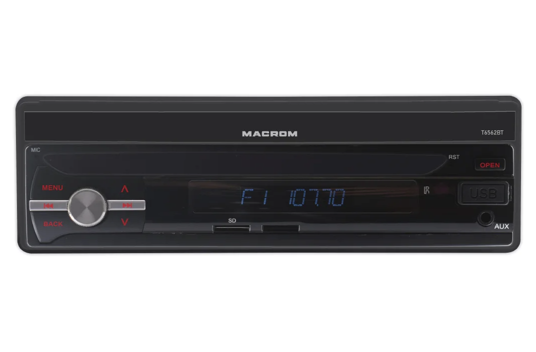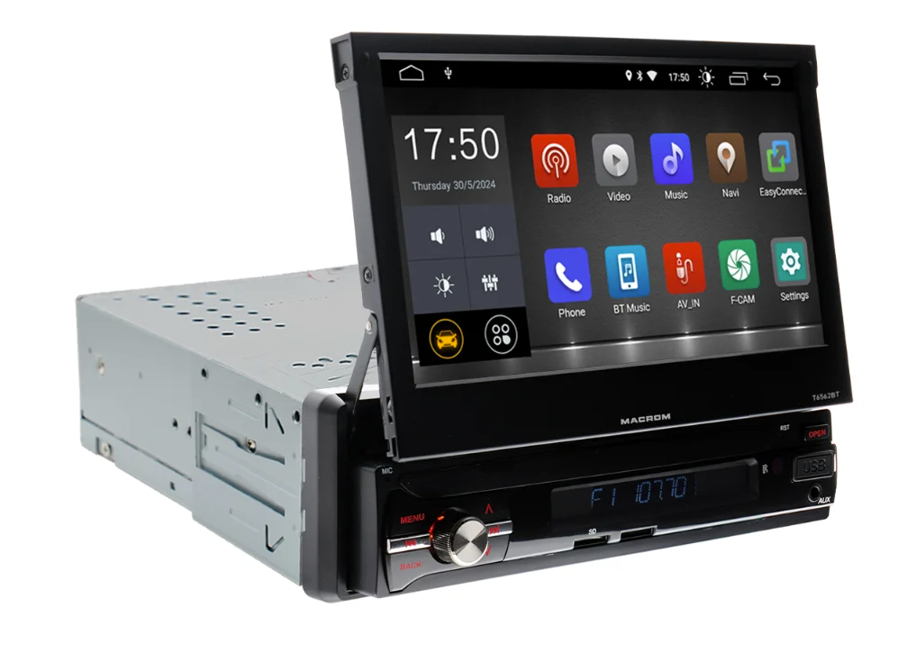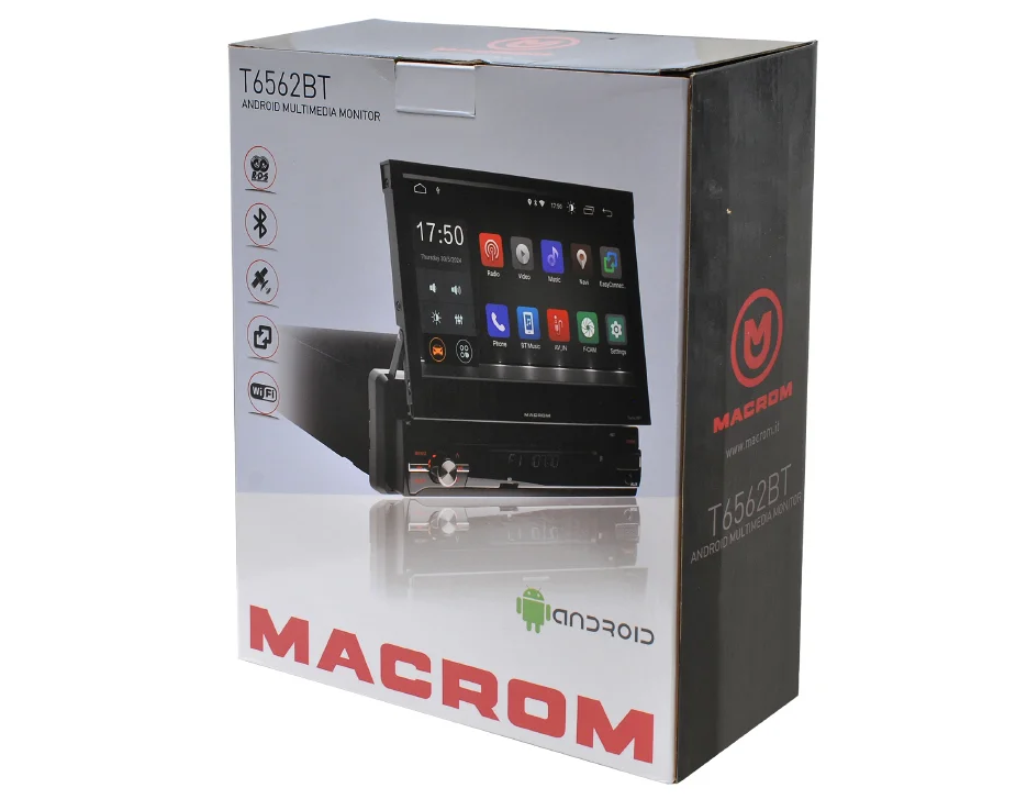 MACROM M-T6562BT je univerzálna multimediálna jednotka s operačným systémom Android 10 a 7″ kapacitným dotykovým displejom, ktorý sa motoricky vysúva z tela prístroja veľkosti 1DIN. Vďaka tomu je možné túto modernú jednotku nainštalovať aj do vozidiel, kde nie je priestor pre klasické 2DIN autorádio. Ponúka výkon 4 × 45 W, Bluetooth handsfree s importom telefónneho zoznamu a podporou streamovania hudby, vstavaný GPS prijímač, Wi‑Fi a široké možnosti pripojenia externých zariadení. Umožňuje online navigáciu, inštaláciu aplikácií, sledovanie videí či počúvanie hudby cez internet rovnako ako na smartfóne alebo tablete.