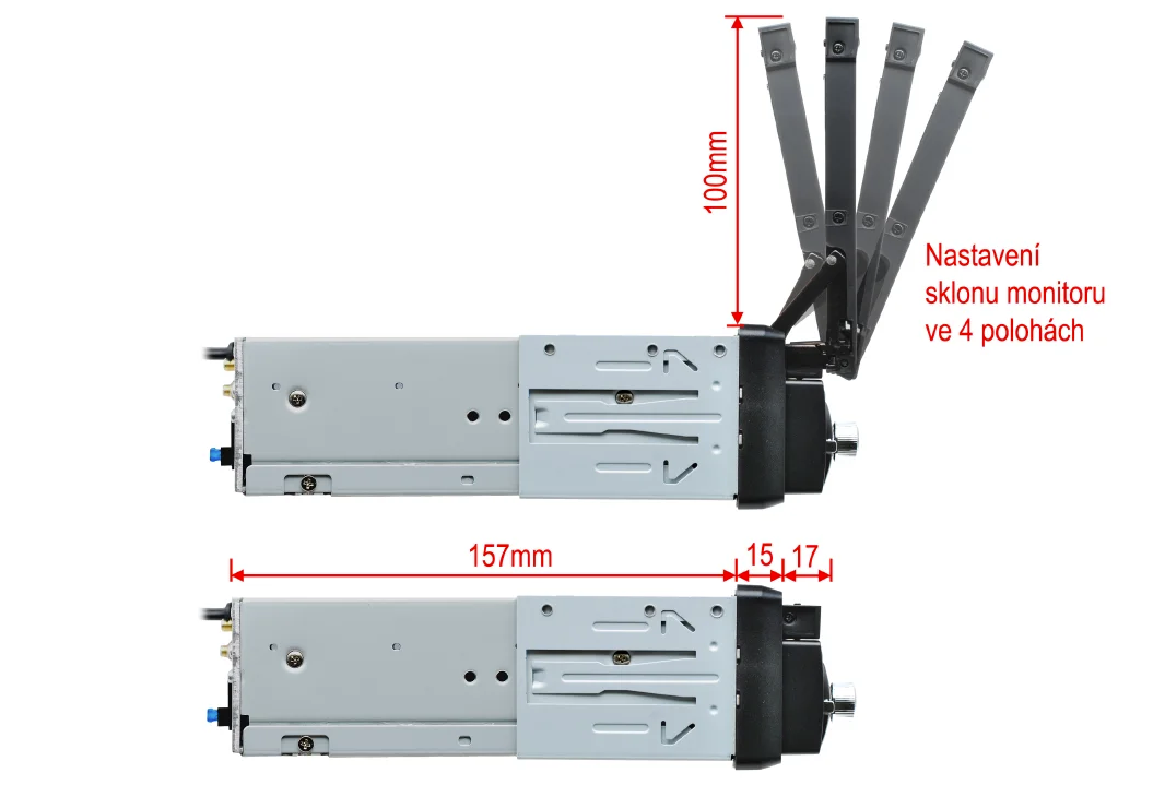 - Displej: 7″ kapacitný, dotykový, pomer strán 16:9, motoricky vysúvací.
