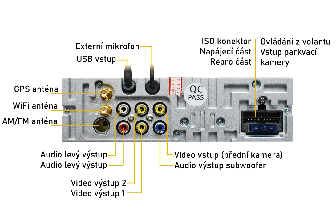 - Veľkosť tela jednotky: 1DIN (otvor cca 182 × 52 mm).