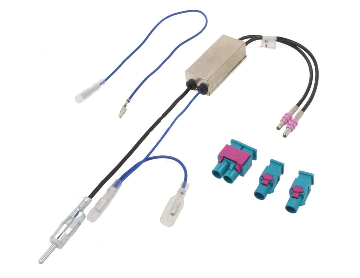 Anténny napájač a zosilňovač signálu pre vozidlá s dvojitou anténou so zosilňovačom napájaným cez anténny vodič (fantómové napájanie). Používa sa pri inštalácii autorádia s jedným anténnym vstupom.- Anténny konektor z automobilovej antény dvojitý FAKRA