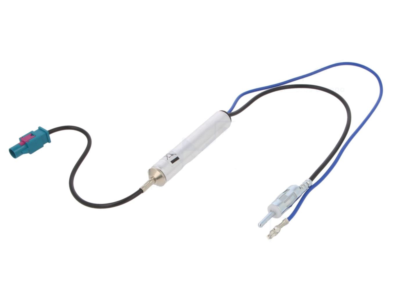 Anténny napájač pre vozidlá s anténou so zosilňovačom napájaným cez anténny vodič (fantómové napájanie). Používa sa pri inštalácii neoriginálneho autorádia.- Anténny konektor od antény v automobilu FAKRA