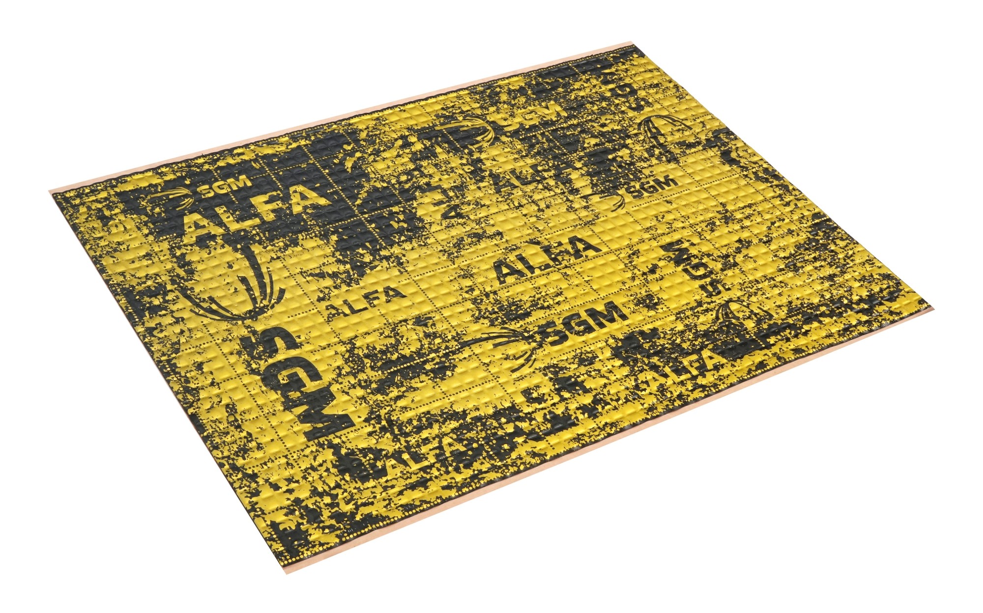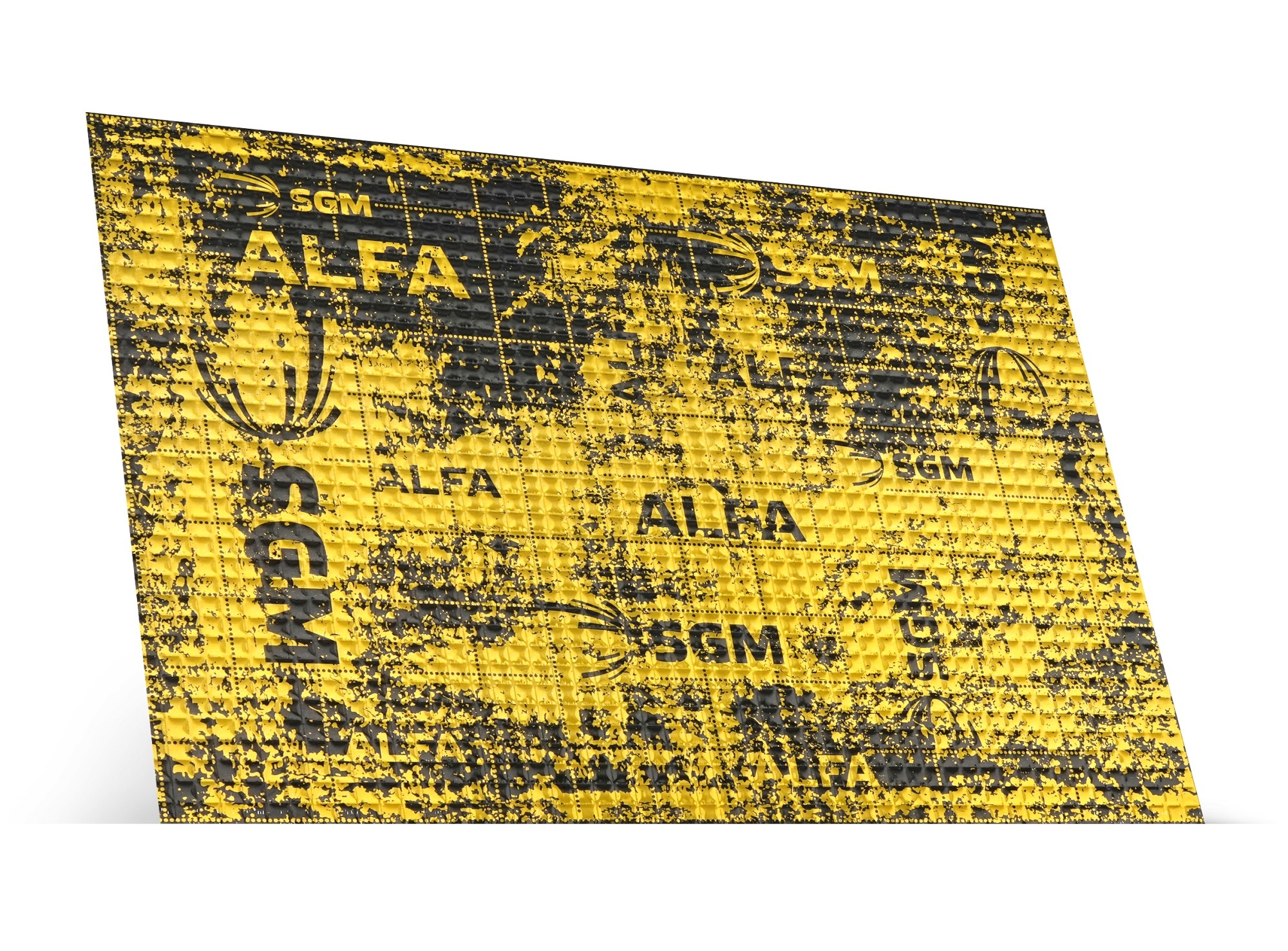 SGM Alpha 3 je pokročilý antivibračný materiál určený pre efektívne potlačenie vibrácií a rezonancií karosérie. Je vyrobený na báze samolepiacej polymérnej butylovej gumy novej generácie a hliníkovej fólie o hrúbke 90 mikrónov. Fólia so štvorcovou ražbou a čierno-zlatým lakom je opatrená moderným potlačou, na montážnej strane je materiál chránený silikónizovanou fóliou. Vysoký akustický stratový činiteľ MLF = 0,40 spolu s hrúbkou 3 mm zabezpečuje výborné vlastnosti pre zóny s vyšším vibračným zaťažením, napríklad podlahu, batožinový priestor alebo motorovú prepážku. Vďaka optimalizovanému zloženiu butylovej gumy s vylepšenou priľnavosťou a tepelnou stabilitou zostáva SGM Alpha 3 spoľahlivý v rozsahu teplôt od –40 °C do +100 °C. Materiál zaručuje vysokú účinnosť v oblastiach, kde je kritická rovnováha medzi hmotnosťou a účinným tlmením vibrácií.