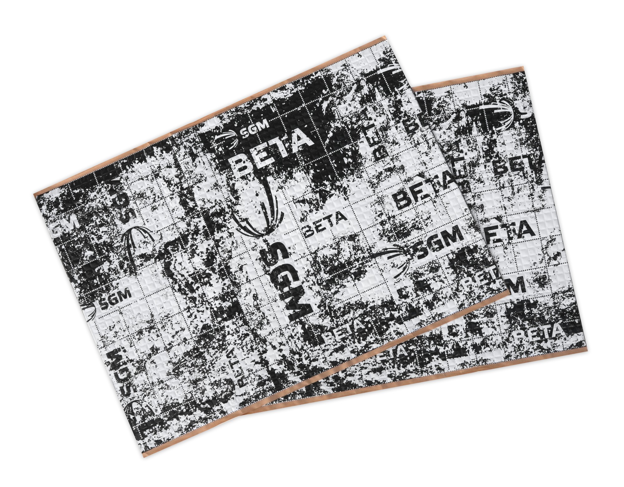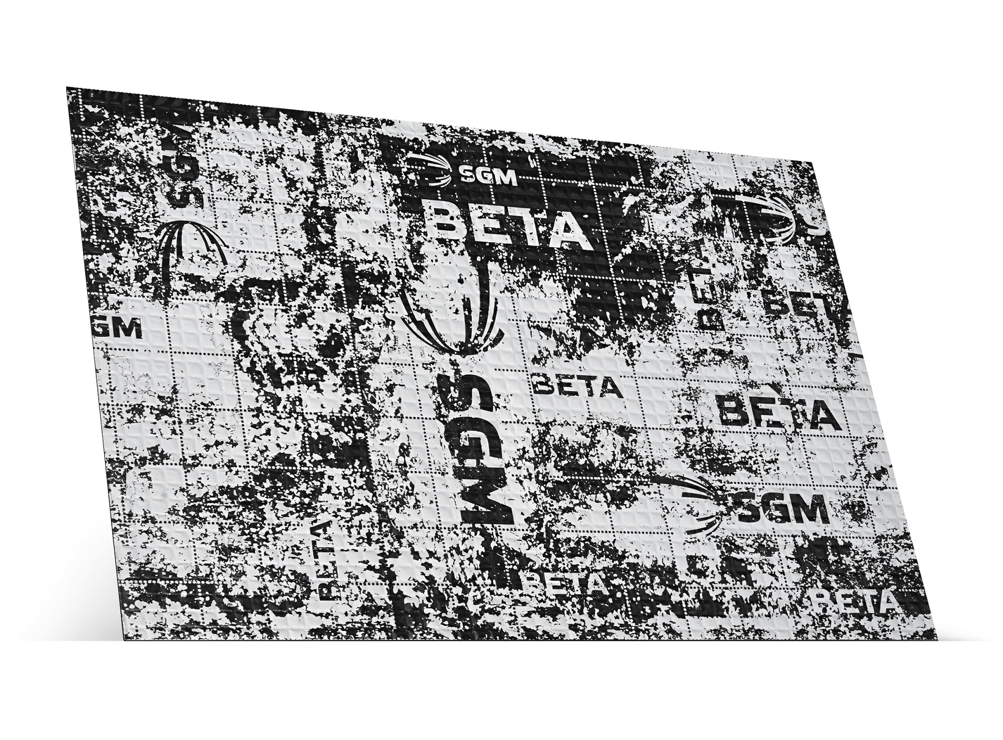 Antivibračný materiál modelového radu Beta od spoločnosti SGM pozostávajúci zo samolepiaceho polyméru butylkaučuku a hliníkovej fólie s hrúbkou 60 mikrónov. Na fólii je vyrazené štvorcové logo výrobcu v čiernom laku a materiál je na montážnej strane chránený silikónovou fóliou. Antivibračný materiál z radu Beta sa vyznačuje nízkou cenou, vysokou priľnavosťou ku kovovým povrchom a stabilitou. Akustický stratový faktor 0,22 jednotiek spolu s hrúbkou 1,7 mm poskytuje dostatočnú schopnosť zabrániť vibráciám. Najväčším rozdielom oproti základnému sortimentu je preto vyššia priľnavosť ku kovu a účinnosť vďaka vyšším hodnotám akustického stratového faktora. Rovnako ako všetky antivibračné materiály SGM je Beta 1 odolná voči vode, vlhkosti, oleju a má antikorózne vlastnosti.