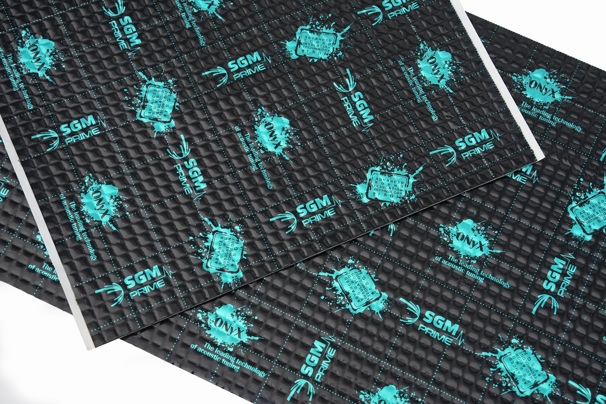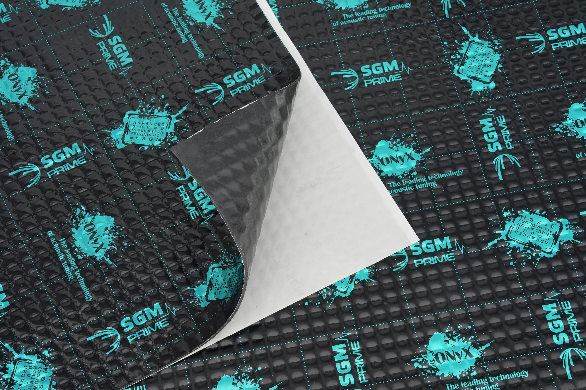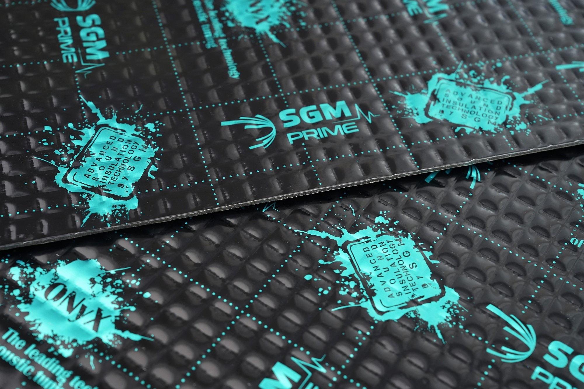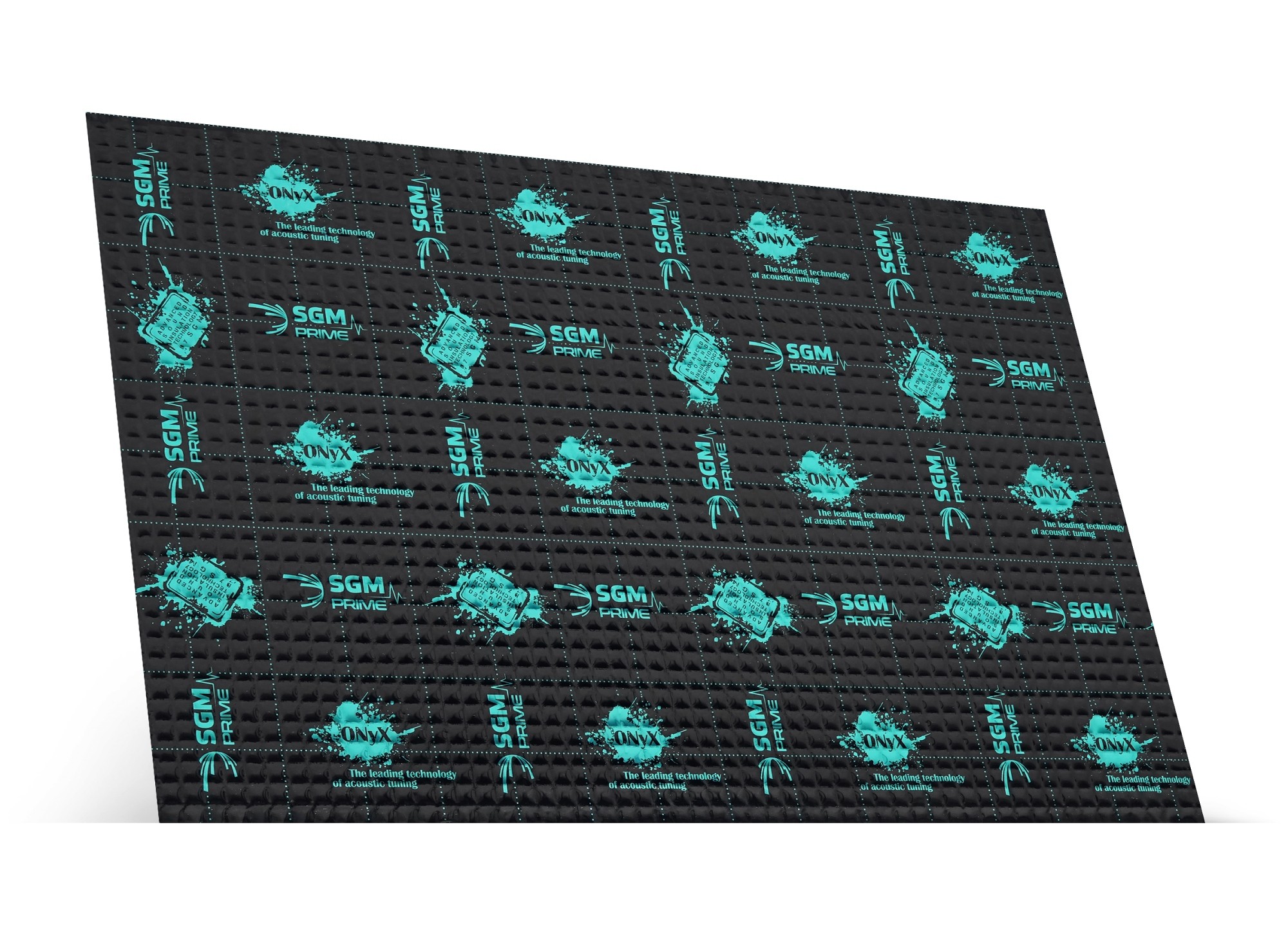 Antivibračný materiál z najvyššieho modelového radu Prime od spoločnosti SGM, ktorý patrí medzi najmodernejšie a najúčinnejšie antivibračné materiály súčasnosti. Jeho vysoká účinnosť je daná nielen viskóznou elastickou štruktúrou tmelu najnovšej generácie, ale aj hliníkovou fóliou so zvýšenou hrúbkou 120 mikrónov zvyšujúce pevnosť a kostru materiálu. Onyx je výnimočný aj tým, že si zachováva excelentnú pružnosť aj pri veľmi nízkych teplotách pod bodom mrazu, ktoré sú typické pre náročné podmienky v Rusku. Štvorcová ražba a čierny lak s modernou potlačou vynikne pri inštalácii do každého vozidla. Akustický stratový činiteľ s excelentnou hodnotou 0,47 jednotiek spolu s hrúbkou 3 mm umožňuje špičkovú schopnosť zamedzenia vibrácií. Tak ako všetky antivibračné materiály spoločnosti SGM sú aj materiály z radu Prime odolné voči vode, vlhkosti, olejom aj extrémnym teplotám a majú antikorózne vlastnosti.