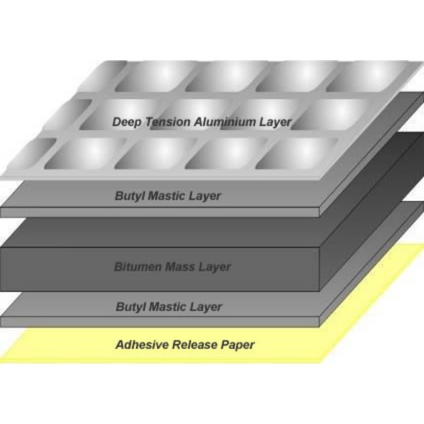 - 1. červená vrstva absorbuje rezonancie, 2. vrstva je čierna kompozitná guma (zvyšuje tuhosť a váhu materiálu) pre pohltenie nízkofrekvenčných rezonancií, 3. vrstva červená absorbuje zvyšok prípadných rezonácií, 4. vrstva je samotný hliník