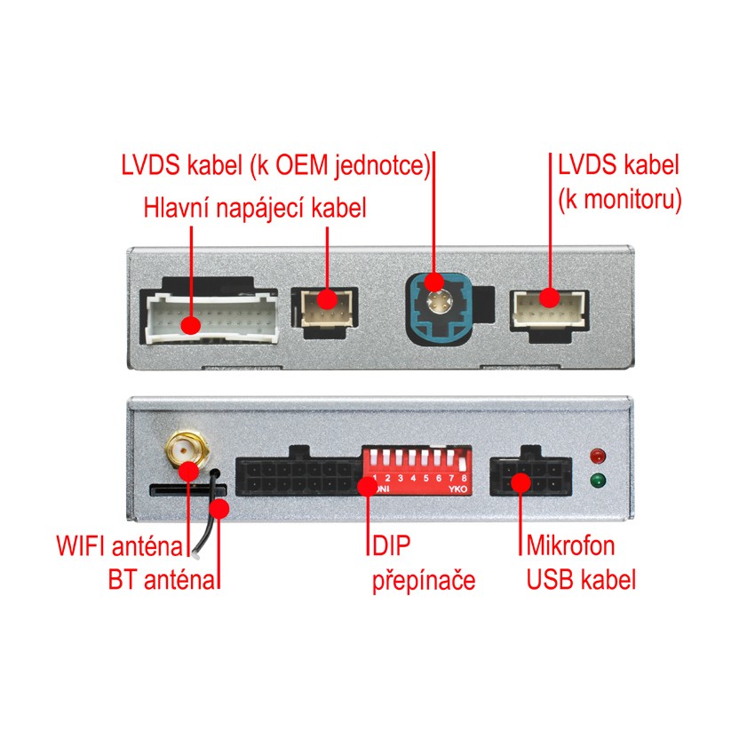 - Modul umožňuje Android Auto a zrkadlenie obrazovky po pripojení káblom.