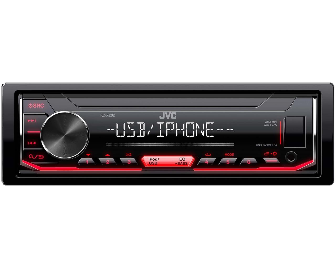 JVC KD-X262 je digitálny prijímač s predným USB a konektorom AUX pre ďalšie prenosné prehrávače hudby. Samozrejmosťou je príjem AM/FM staníc. Veľký a ľahko čitateľný LCD displej jasne zobrazí všetky informácie, v kombinácii s červeným podsvietením kláves pre jednoduché ovládanie. Autorádio umožňuje ovládanie na volante a výkonný zosilňovač 4 x 50 W zvýši výkon vašich reproduktorov. Ak budete chcieť pridať externý zosilňovač, sú k dispozícii dva 2,5V výstupy. Kvalita zvuku je zaistená plne digitálnym spracovaním zvuku a časovými korekciami spolu s 13pásmovým grafickým ekvalizérom. Upozorňujeme, že tento model neobsahuje CD mechaniku. To však umožňuje znížiť hĺbku produktu na 100 mm, čo oceníte pri vozidlách s menším montážnym priestorom v palubnej doske.