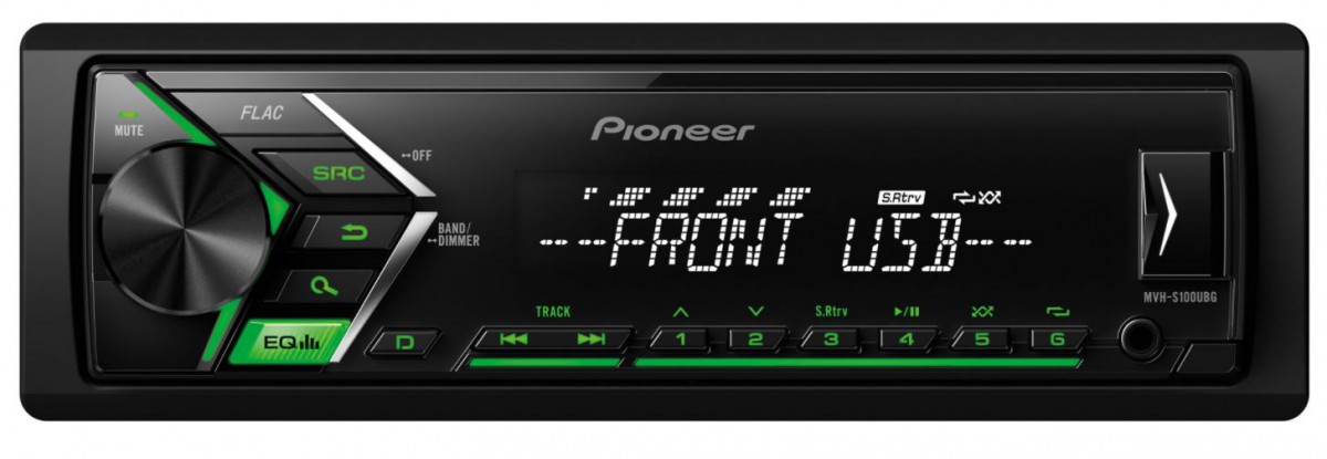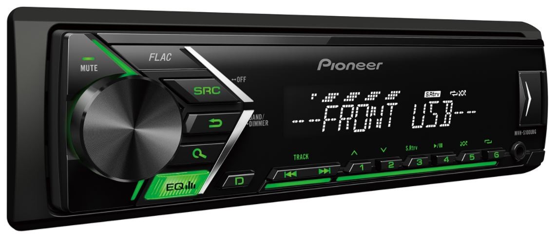 Bezmechanikové autorádio Pioneer MVH-S100UB so zeleným podsvietením tlačidiel, ktoré za veľmi prijateľnú cenu podporuje formát FLAC a navyše skvele vyzerá. Špeciálne vyvinuté autorádio pre digitálnu hudbu, pre pripojenie s Android smartphonom a ďalšími zariadeniami pomocou predného USB vstupu alebo AUX. Týmto spôsobom môžete počúvať svoje obľúbené skladby a zároveň dobíjať batériu mobilného telefónu (cez USB). Toto rádio ponúka 4x50 W čisté MOSFET sily a kvalitnú reprodukciu zvuku. Vďaka zadnému RCA výstupu môžete inštalovať aktívny subwoofer alebo zosilňovač .