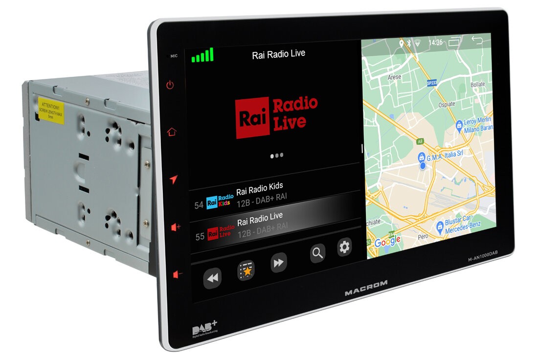 Multimediálny prehrávač s 10,1“ kapacitným displejom, 2DIN telo prístroja, operačný systém Android 10, vstavaný DAB tuner.Macrom M-AN1000DAB je multimediálna jednotka s operačným systémom Android. 2DIN veľkosť a 10,1" kapacitný displej vo forme tabletu, umožňuje inštaláciu do radu automobilov, kam doteraz nebolo možné inštalovať jednotku s touto veľkosťou monitora. Prístroj je vybavený zosilňovačom 4x45W, AM/FM DAB/DAB+ tunerom, Bluetooth hands free sadou s podporou streamovanie hudby, tromi zadnými USB konektormi, mikro SD kartou, vstupom pre zadnú a prednú parkovaciu kameru, integrovaným GPS prijímačom, WIFI....Operačný systém Android Oreo10 umožňuje používať prístroj rovnako ako by ste používali smartphone alebo tablet.Môžete čítať emaily, vyhľadávať informácie na internete, prehrávať hudbu alebo videá na YouTube, sledovať Netflix, kontrolovať svoje emaily, inštalovať obľúbené aplikácie a mnoho ďalších funkcií.