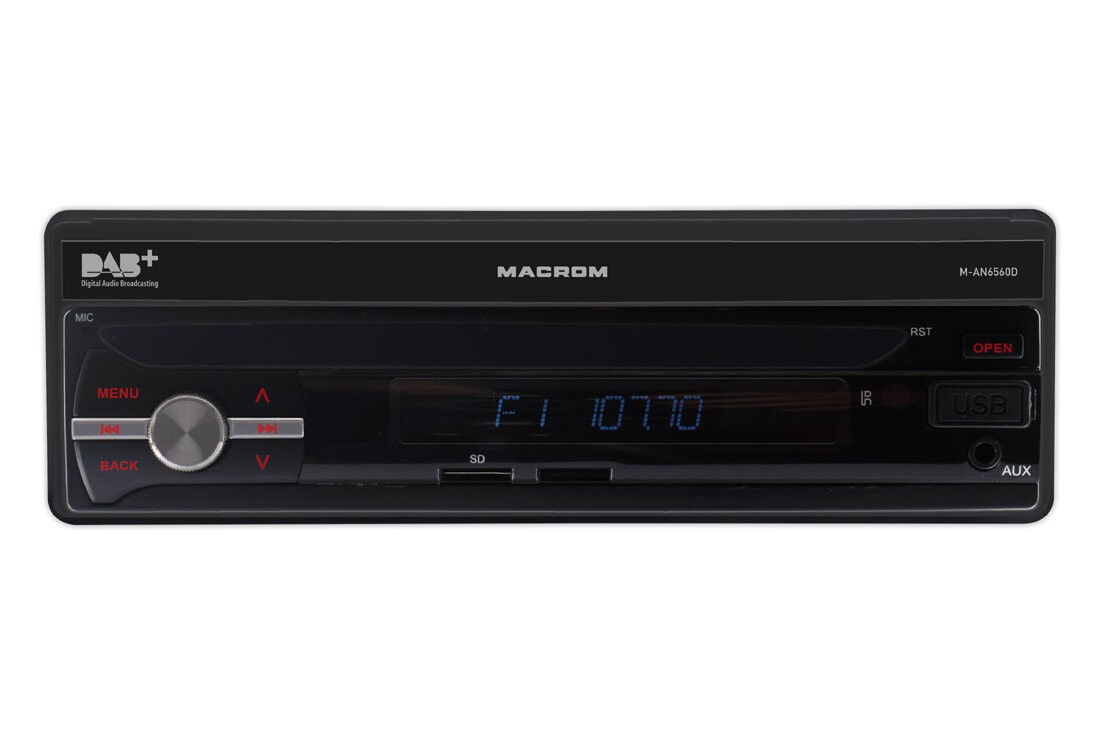 Multimediálny prehrávač so 7“ kapacitným, motorovým vysunovacím displejom, 1DIN telo prístroja, operačný systém Android 10, vstavaný DAB tuner. MACROM M-AN6560DAB je multimediální jednotka s operačným systémom Android a zabudovaným DAB tunerom. 1DIN veľkosť a 7" kapacitný displej vo forme terý je motorovo vysunovaný z tela prístrojov, umožňuje inštaláciu do radu automobilov, kam doteraz nebolo možné inštalovať jednotku s touto veľkosťou monitoru. Prístroj je vybavený zosilňovačem 4x45W, AM/FM a DAB/DAB+ tunerom, Bluetooth hands free sadou s podporou streamovania hudby, tromi zadními USB konektory, vstupom pre zadní a prednou parkovacou kamerou, integrovaným GPS prijímačom, WIFI.... Operačný systém Android 10, umožňuje používať prístroj rovnako, ako ste používali smartphone alebo tablet. Môžete čítať emaily , vyhľadávať informácie na internete, prehrávať hudbu alebo videá na YouTube, kontrolovať svoje emaily, inštalovať obľúbené aplikácie a mnoho ďalších funkcií.Základné funkcie