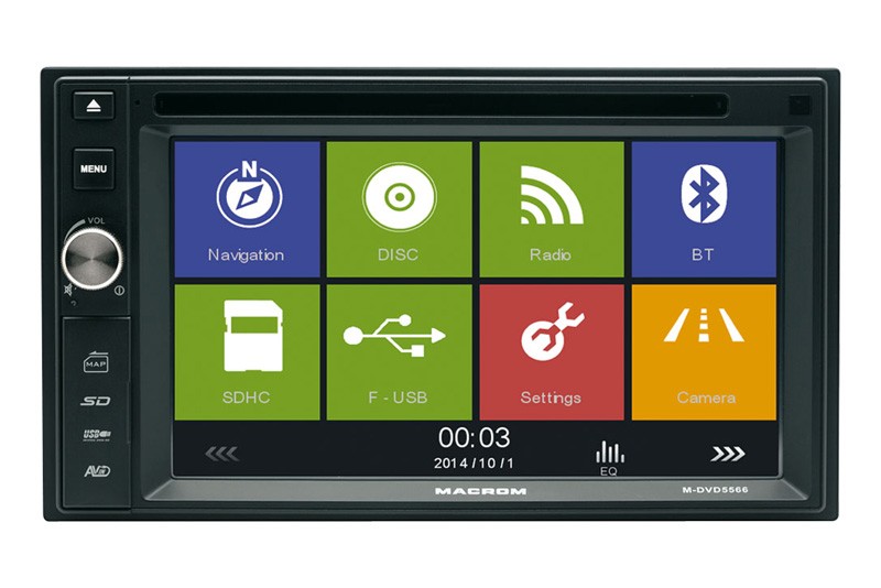 MACROM M-DVD5566 je multimediálna jednotka so vstavanou DVD mechanikou, USB predným a zadným vstupom a SD čítačkou pamäťových kariet. Prístroj je vybavený dotykovým monitorom 6,2 palcov, vstupom pre cúvaciu kameru (po zaradení spiatočky), vstupom pre ovládanie z volantu. MACROM obsahuje vstavanú GPS navigáciu a Hands free sadu s externým mikrofónom. Pomocou 2DIN inštalačného rámčeka možno umiestniť do väčšiny typov automobilov.