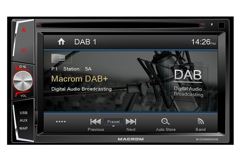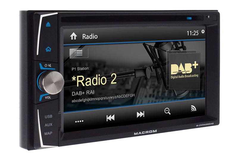 Macrom M-DVD6000DAB je multimediálna jednotka s DAB rádiovým prijímačom, vstavanou GPS navigáciou, vstavanou CD / DVD mechanikou, USB predným a zadným vstupom a SD čítačkou pamäťových kariet. Prístroj je vybavený dotykovým monitorom 6,2", vstupom pre cúvaciu kameru (po zaradení spiatočky), vstupom pre ovládanie z volantu. Macrom M-DVD6000DAB obsahuje Hands free sadu s externým mikrofónom. Pomocou 2DIN inštalačného rámčeka možno umiestniť do väčšiny typov automobilov.