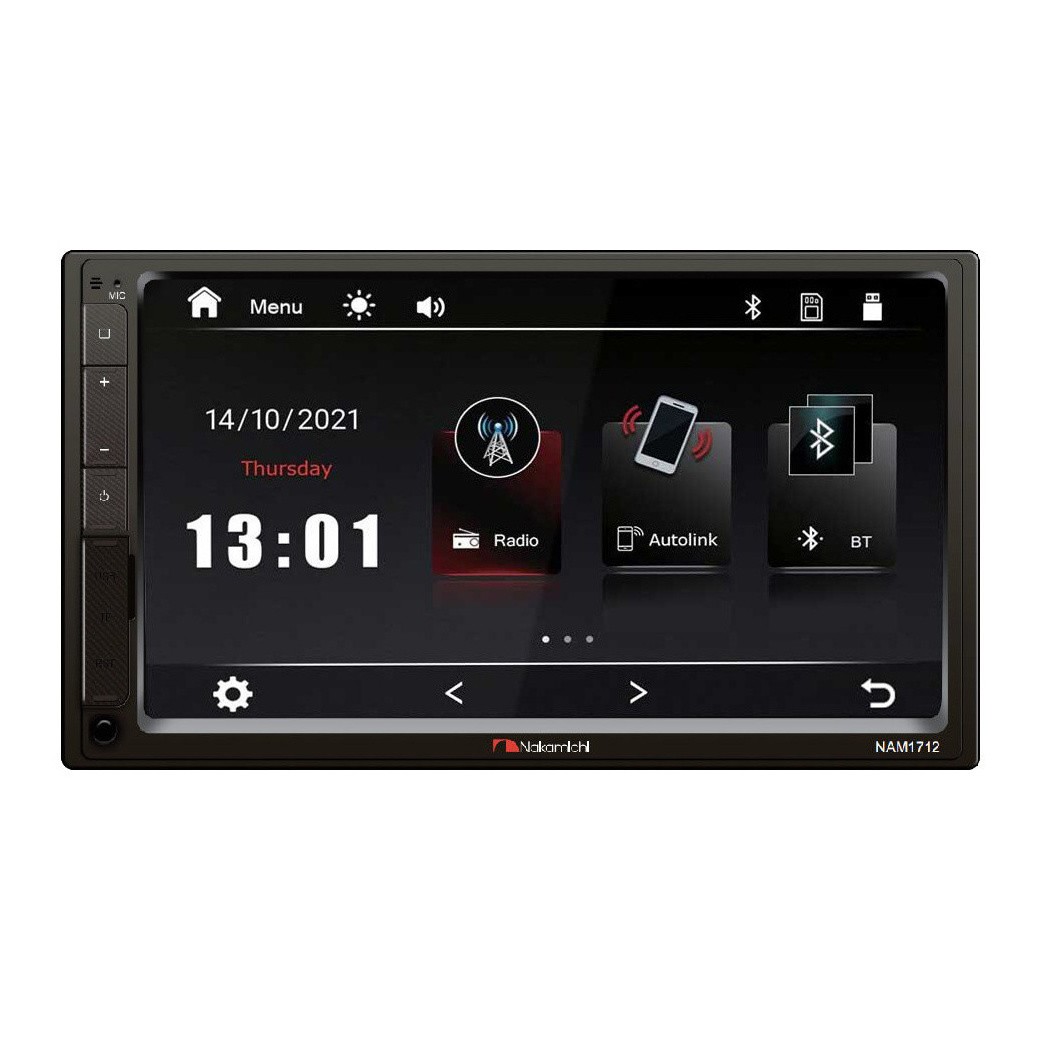 Nakamichi NAM1712 je bezmechanikové autorádio s veľkosťou 2DIN, ktoré disponuje dotykovým displejom s veľkosťou 7". Na čelnej aj zadnej strane nájdete USB vstup, cez ktorý môžete prehrávať obľúbenú hudbu alebo multimédiá. Samozrejmosťou je aj Bluetooth pre bezpečné telefonovanie a streamovanie hudby. Mikrofón je u tohto modelu integrovaný, je však možné pripojiť aj externý mikrofón. Farbu tlačidiel môžete vyberať podľa ľubovôle vďaka variabilnému podsvieteniu, v balení nájdete aj diaľkový ovládač a poteší aj 3 páry RCA výstupov (4V) pre zosilňovač. Zameranie na vyššiu kvalitu zvuku je zrejmé aj vďaka vstavanému DSP procesoru, na ktorom môžete nastaviť aj časové korekcie alebo 16pásmový ekvalizér.