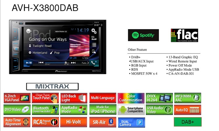 2DIN autorádio Pioneer, ktoré oproti bežným funkciám má aj vstavaný modul pre príjem DAB + rádia . DAB + anténa nie je súčasťou balenia. Užite si váš obľúbený obsah na veľkom 6,2 "dotykovom displeji priamo na vašej palubnej doske. Jednoduché pripojenie k smartphonu iPhone alebo Android pomocou USB kábla tak, aby ste mohli ovládať aplikácie pohodlne priamo na hlavnom paneli. < strong>Pioneer AVH-X3800DAB prehráva obsah z CD, DVD diskov a USB zariadenia. Má tiež zabudovaný DAB + tuner pre počúvanie rozhlasových staníc v digitálnej kvalite bez skreslenia zvuku. Toto autorádio umožňuje pripojiť dve Bluetooth zariadení súčasne pre bezdrôtové streamovanie hudby alebo hands-free hovory. Ďalšími príjemnými funkciami je nepochybne 13-pásmový grafický ekvalizér a funkcie MIXTRAX EZ , vďaka ktorej si môžete vychutnať svoje obľúbené hity v non-stop mixu s efektmi DJ štýlu.