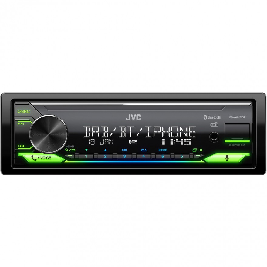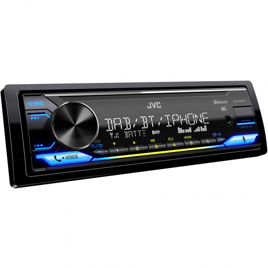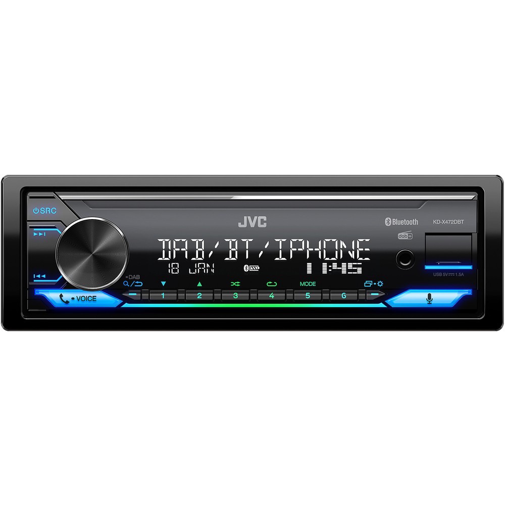 JVC KD-X472DBT je prijímač digitálnych médií s integrovaným tunerom DAB+ pre krištáľovo čisté počúvanie rádia a technológiou Bluetooth pre handsfree volanie a bezdrôtové streamovanie hudby. Dodáva sa s aplikáciami Alexa, Spotify a JVC Remote App. Veľký a ľahko čitateľný LCD displej jasne zobrazí všetky informácie v kombinácii s variabilným farebným podsvietením kláves pre jednoduché ovládanie. Autorádio umožňuje ovládanie na volante a výkonný zosilňovač 4 x 50 W zvýši výkon vašich reproduktorov. Ak budete chcieť pridať externý zosilňovač, sú k dispozícii dva 2,5 V výstupy. Kvalita zvuku je zaistená plne digitálnym spracovaním zvuku a časovými korekciami spolu s 13pásmovým grafickým ekvalizérom. Upozorňujeme, že tento model neobsahuje CD mechaniku. To však umožňuje znížiť hĺbku produktu na 100 mm, čo oceníte pri vozidlách s menším montážnym priestorom v palubnej doske.