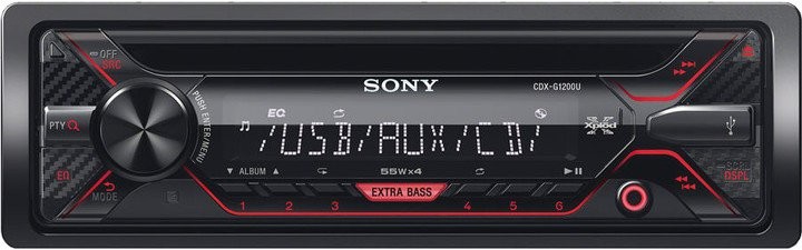 Autorádio Sony rozmerov 1DIN s CD prehrávačom, predným USB vstupom s podporou prehrávania FLAC, predným AUX vstupom, MEGA BASS EQ5 a výstupným výkonom 4 x 55 W, červená farba podsvietenia. Predný panel je odnímateľný.