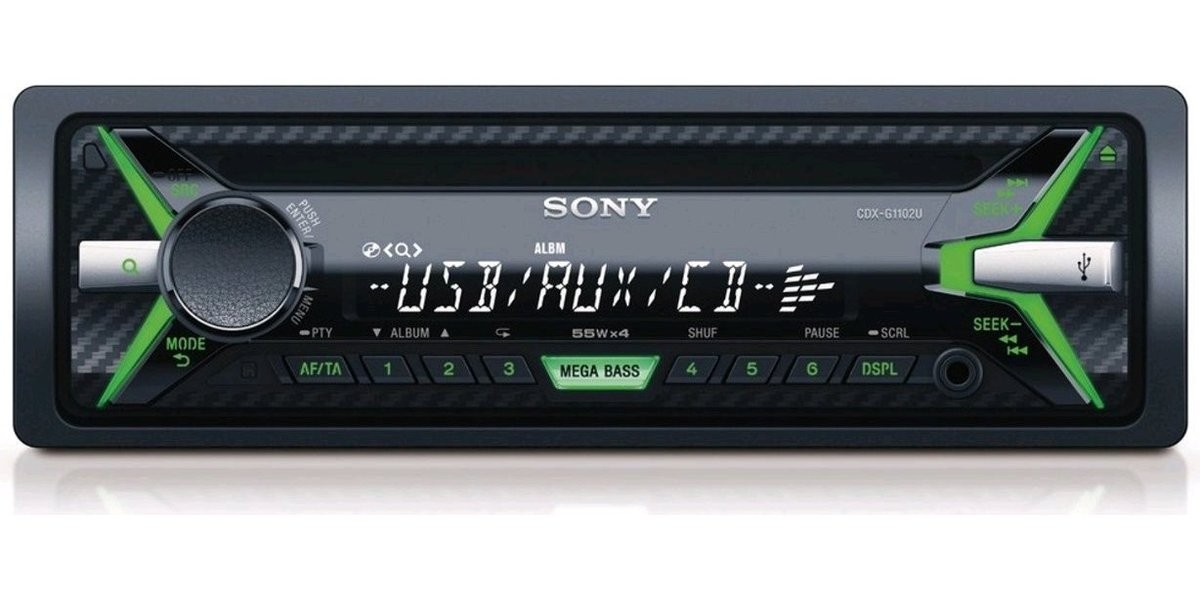 Autorádio SONY rozmeru 1DIN s CD prehrávačom, USB vstupom, MEGA BASS EQ5 a výstupným výkonom 4 x 55W, zelená farba podsvietenia.