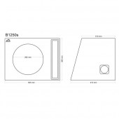 | Rozmery ozvučniceRozmery ozvučnice sú uvádzané ako výška, šírka a hĺbka, ktorá je často na spodnej hrane dlhšia ako na hornej hrane, z dôvodu skosenie zadnej steny. | 505 x 410/310 x 385 mm |