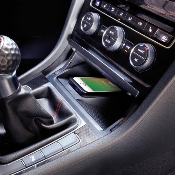 Bezdrôtová nabíjačka telefónu Qi pre VW Golf 7. Bezdrôtové nabíjanie pomocou štandardu Qi funguje na princípe elektromagnetickej indukcie. Nové telefóny majú tento prijímač zvyčajne už zabudovaný, do iných je potrebné namontovať zadný kryt so zabudovaným prijímačom alebo je potrebné samotný prijímač vložiť pod zadný kryt telefónu. Stačí ho položiť a telefón sa nabíja.Vhodné pre automobily: