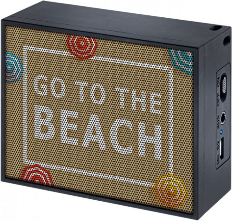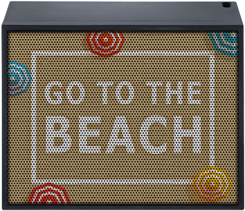 - Mriežka reproduktorov s dizajnovým nápisom Go to the beach na béžovom podklade s farebnými slnečníky