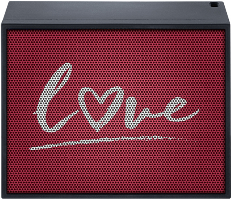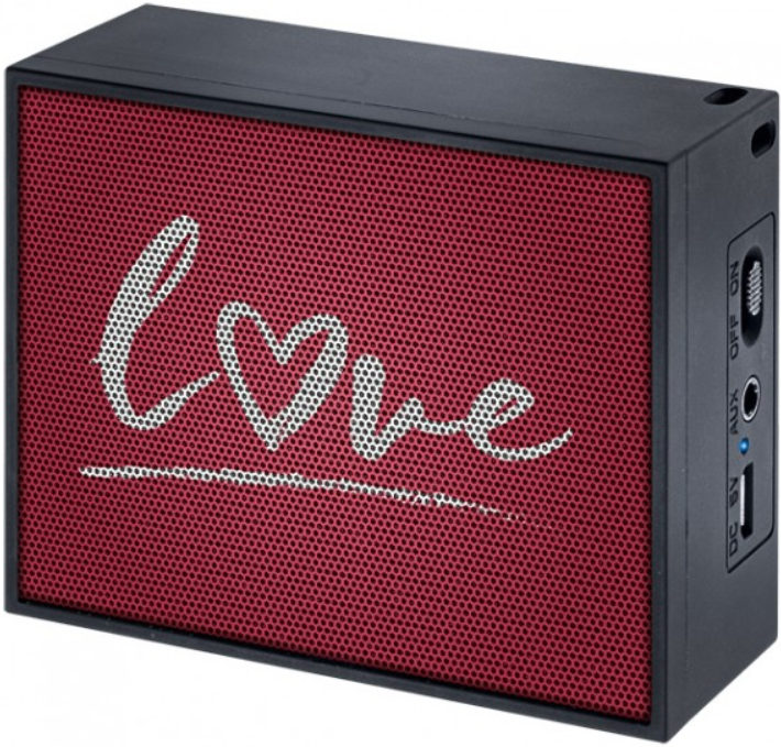 - Mriežka reproduktorov s dizajnovým nápisom Love na červenom podklade