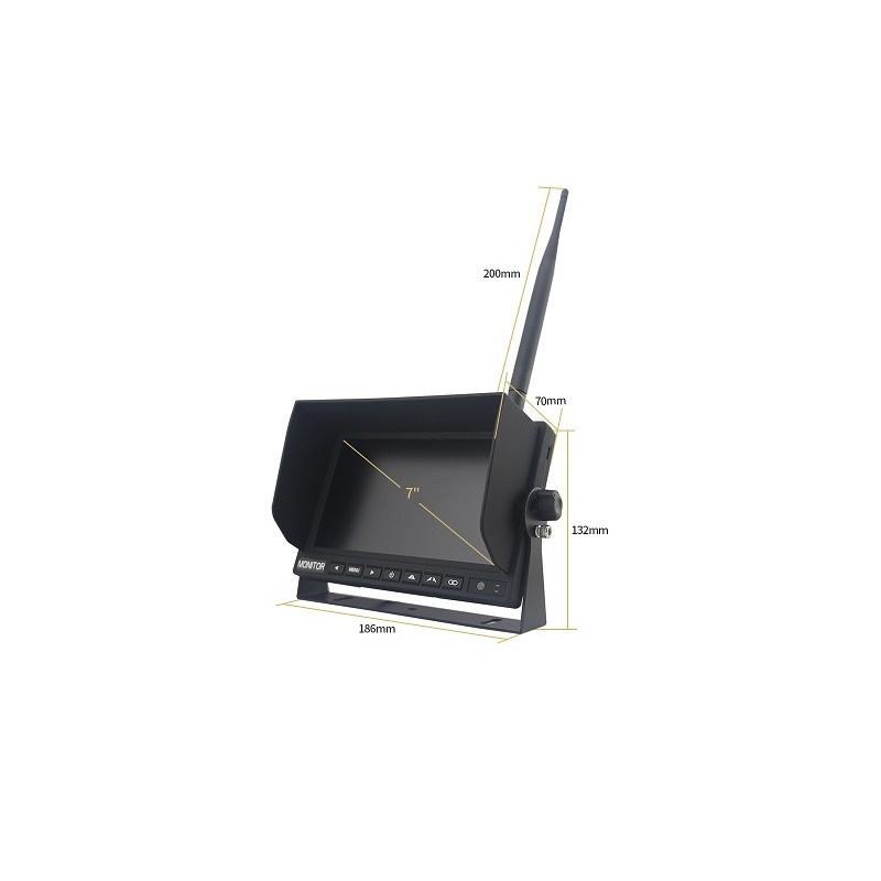 AHD Bezdrôtový set kamera 720p / monitor 7" do vozidla, s kamerou s IR prisvietením, rozlíšenie monitora 1024 x 600, pre pripojenie až štyroch kamier, súčasné zobrazenie záberu viac kamier, 12 / 24V, možnosť otočiť obraz o 180°, jednoduché a rýchle riešenie pre pripojenie kamery (ako parkovacie alebo bočné, prípadne kamery v ložnom priestore).