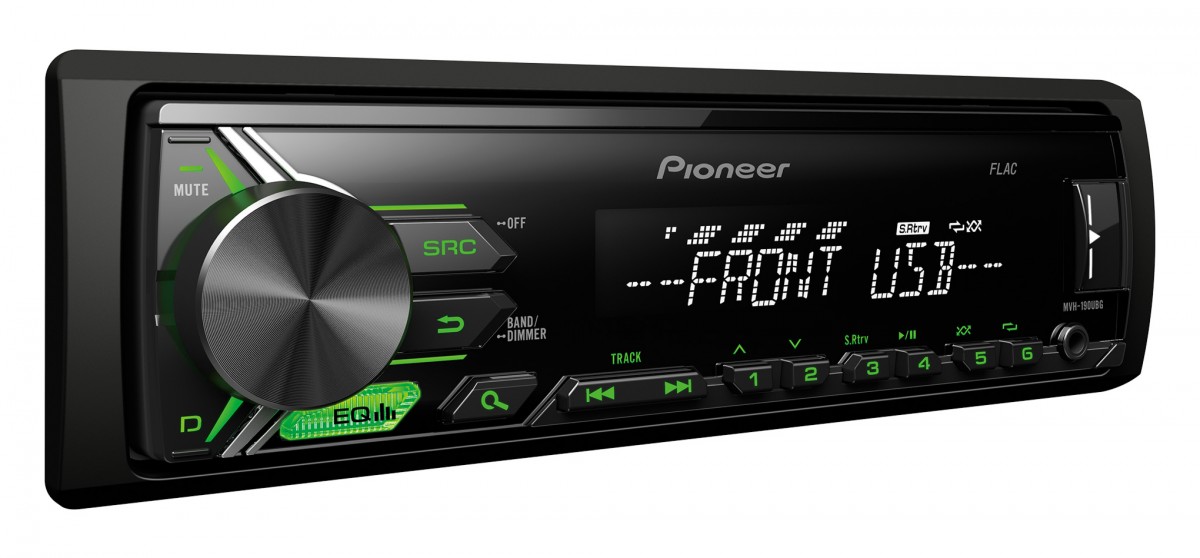 Bezmechanikové autorádio Pioneer MVH-190UBG so zeleným podsvietením tlačidiel, ktoré za viac ako dostupnú cenu podporuje formát FLAC a navyše vyzerá veľa dobre. Špeciálne vyvinuté pre digitálnu hudbu, pre pripojenie s Android smartphonom a ďalšími zariadeniami pomocou predného USB vstupu alebo AUX. Týmto spôsobom môžete počúvať svoje obľúbené skladby a zároveň dobíjať batériu (cez USB). Toto rádio ponúka 4x50 W čisté MOSFET sily a vysoko kvalitnú reprodukciu zvuku. Vďaka zadnému RCA výstupu môžete inštalovať subwoofer alebo zosilňovač.
