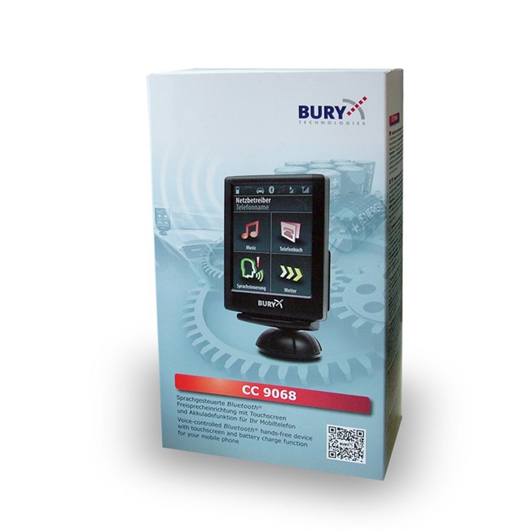 Bluetooth handsfree sada BURY CC9068 s 2,8" TFT displejom a hlasovým ovládaním určená na bezpečné a komfortné telefonovanie počas šoférovania. Zariadenie je určené na inštaláciu do vozidla odborným servisom, pripája sa k existujúcim reproduktorom audiosúpravy vozidla. K zariadeniu je možné pripojiť a používať 2 telefóny súčasne (Multipoint), je kompatibilné s rôznymi výrobcami telefónov.
