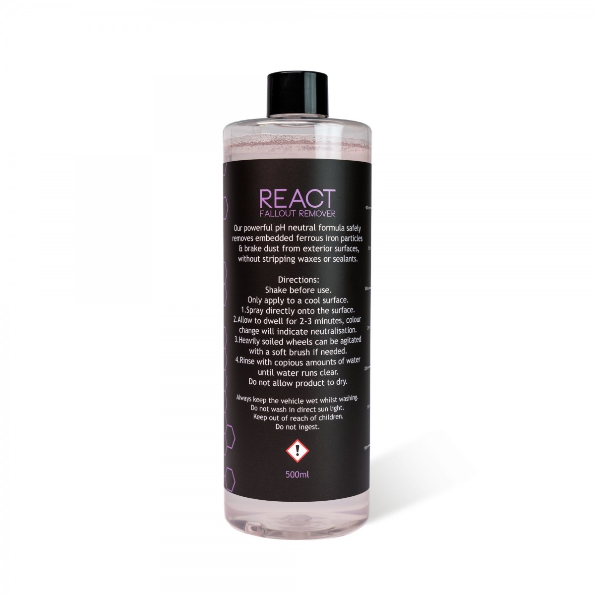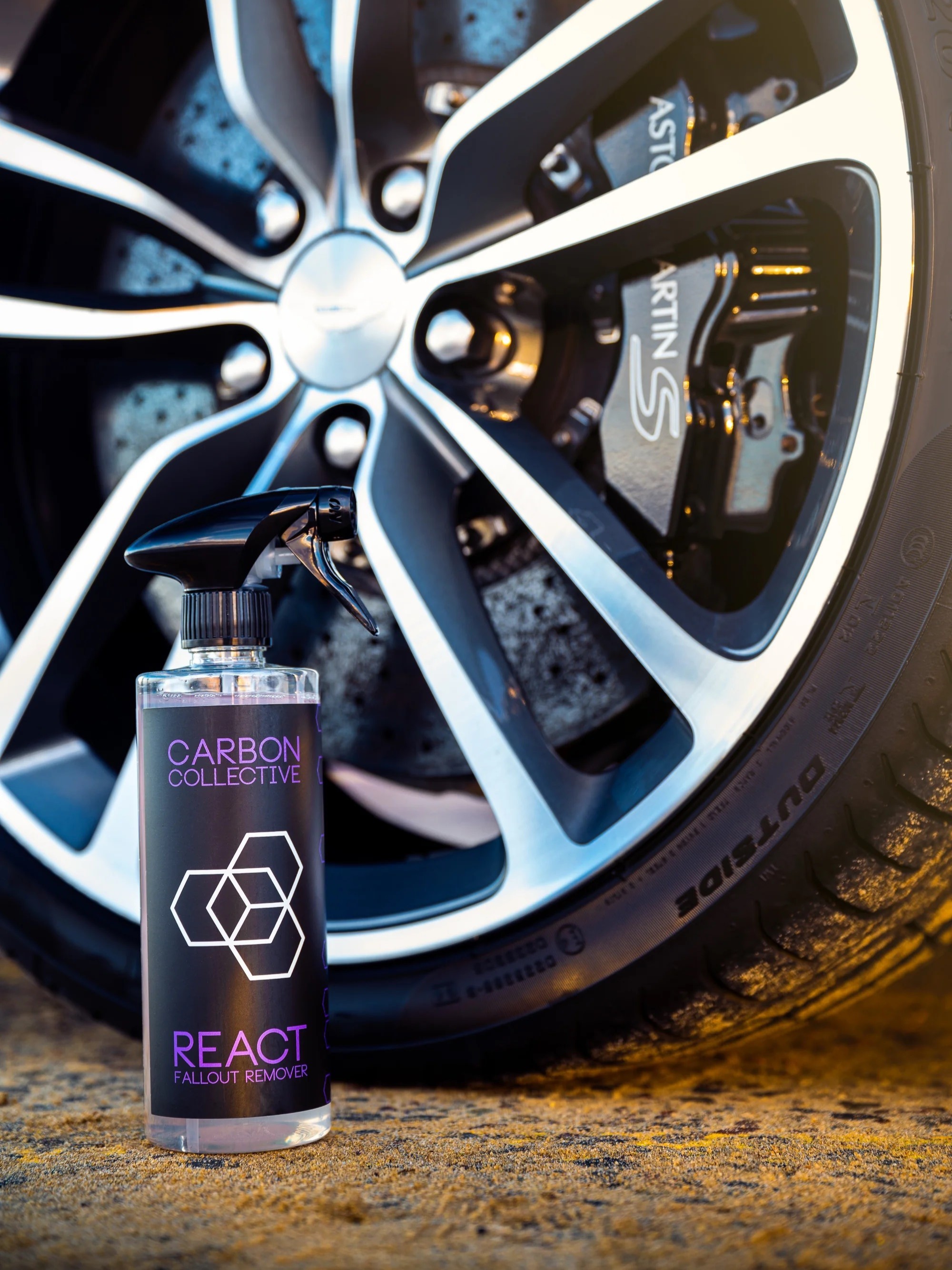 Carbon Collective React Fallout Remover Wheel Cleaner je šetrný čistič kolies a odstraňovač vzdušnej hrdze v jednom. Inovované zloženie React je ešte účinnejšie, čo umožňuje dlhšie pôsobenie prípravku na povrchu. Carbon Collective React je jeden z mála odstraňovačov vzdušnej hrdze, ktorý má príjemnú vôňu a nezapácha. React je čistiaci prostriedok bez kyselín, je silný, ale pritom pH neutrálny, bezpečný pre použitie na takmer všetkých vonkajších povrchoch a povrchových úpravách. Obsahuje špeciálnu látku, ktorá reaguje pri kontakte so železnými časticami a rozpúšťa ich. Súčasťou balenia je aj chemicky odolný rozprašovač.