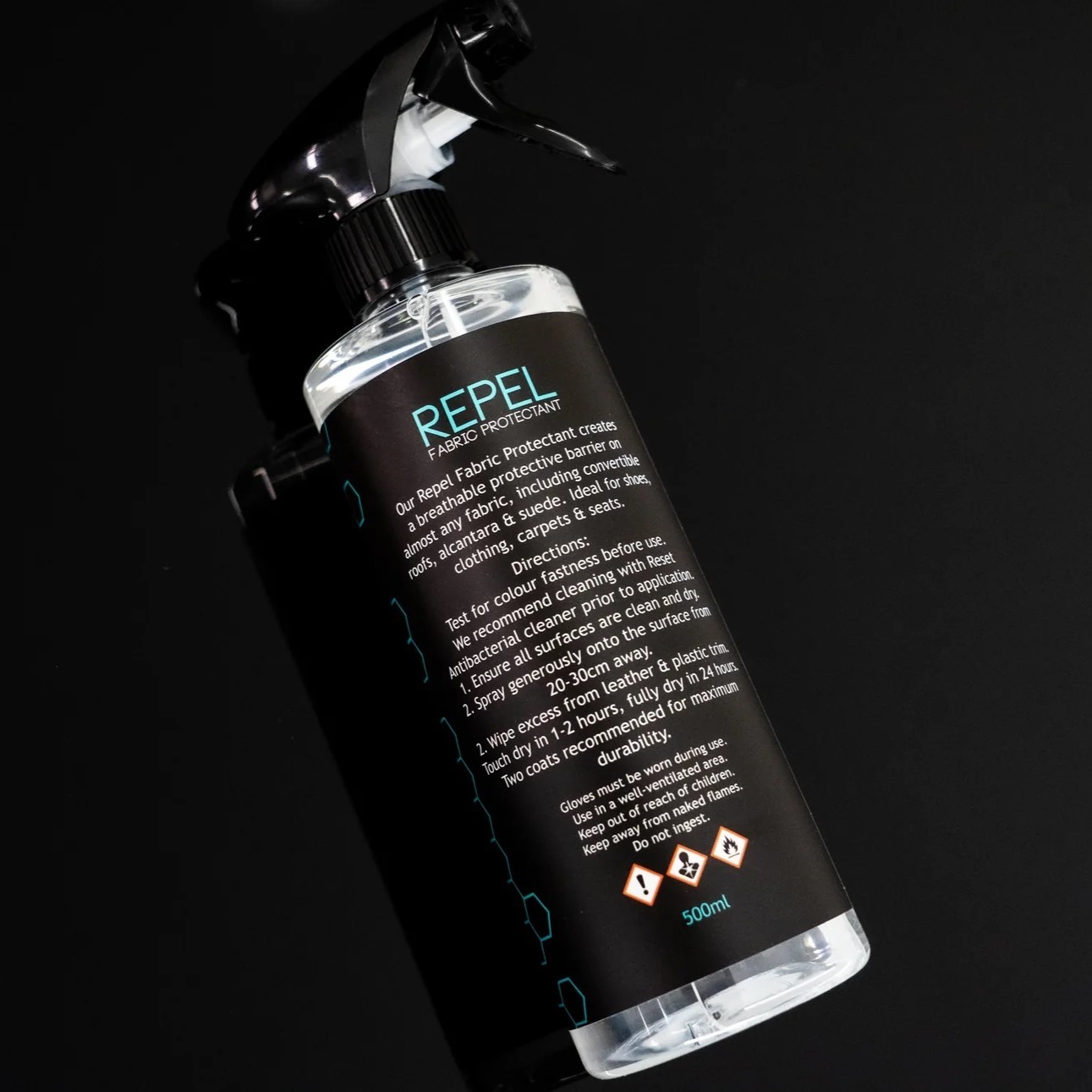Repel 2.0 dokáže vytvoriť dokonalý hydrofóbny povlak na textil, ktorý vytvorí bezkonkurenčné ochrannú bariéru a zaistí špičkovú úroveň odpudzovania vody. Je ideálny pre väčšinu tkanín vrátane semišu, alcantary alebo kože, navyše chráni pred vyliatím, škvrnami, chemikáliami a poškodením vodou. Na rozdiel od mnohých iných prípravkov chrániacich textílie sa Repel 2.0 spojí s jednotlivými vláknami, čo umožňuje, aby textil zostával pružný a priedušný. Repel 2.0 funguje na báze rozpúšťadla, schne rýchlejšie, prenikne hlbšie do látky a nezmení farbu alebo povrchovú úpravu tkaniny. Môžete ho použiť aj na plátené strechy kabrioletov. Navrhnuté pre spoluprácu s Reset antibakteriálnym čistiacim prostriedkom, pred aplikáciou prípravku Repel 2.0 povrch vždy dôkladne očistite. Táto metóda vytvára silnejšiu väzbu pre Repel a zaisťuje maximálnu ochranu a trvanlivosť. Súčasťou balenia je aj rozprašovač.