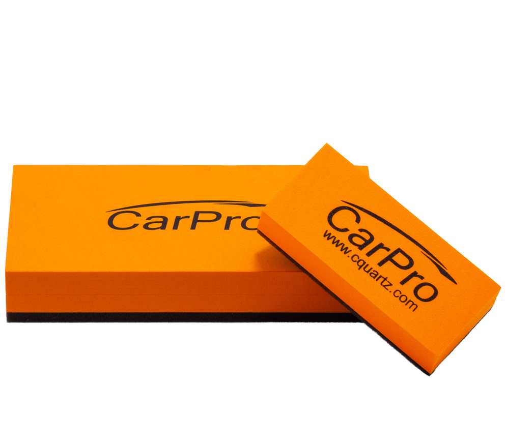 Originálny aplikátor CarPro Large na aplikáciu keramických povlakov s čiernou pracovnou stranou, ktorá je vyrobená z jemnej a mäkkej peny o hrúbke iba 4 mm, zatiaľ čo zvyšok tvorí tuhý a nesavý polyuretán oranžovej farby s logom značky. Vďaka tomu má aplikátor CarPro veľmi malú savosť a na rozdiel od bežných penových alebo mikrovláknových aplikátorov zamedzuje zbytočnému plytvaniu keramickej ochrany laku. Vďaka presnému pravouhlému tvaru a kompaktným rozmerom 8 x 15 cm zaručuje presnú prácu, a vďaka výške 2,5 cm sa aplikátor skvele drží aj v gumových rukaviciach. Na nanášanie ochranných povlakov CarPro CQuartz a tekutých stieračov FlyBy sa aplikátor používa spolu s mikrovláknovými aplikačnými utierkami, ktoré umožňujú nanesenie rovnomernejšej vrstvy povlaku. Pre tento prípad je hranatý aplikátor vybavený pozdĺžnymi zárezmi na pevné zasunutie aplikačných utierok, čo výrazne spríjemňuje komfort práce a nestane sa vám, že by utierka spadla na zem. Mäkká pracovná vrstva dokonale kopíruje malé nerovnosti karosérie.