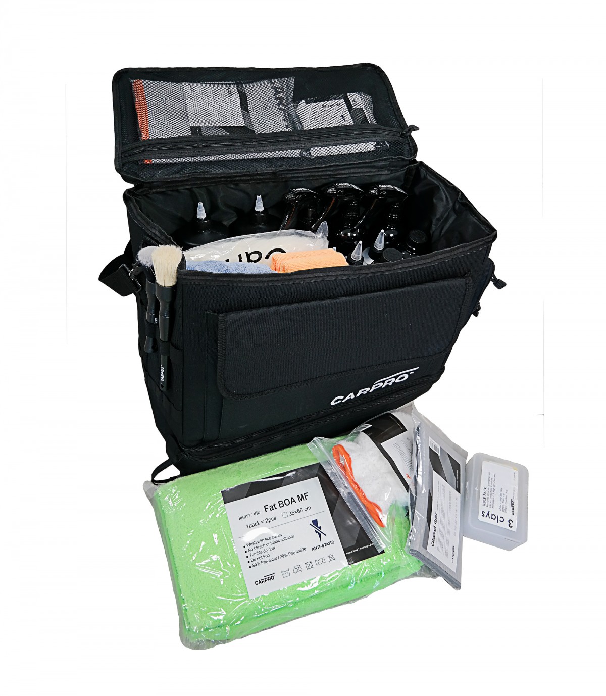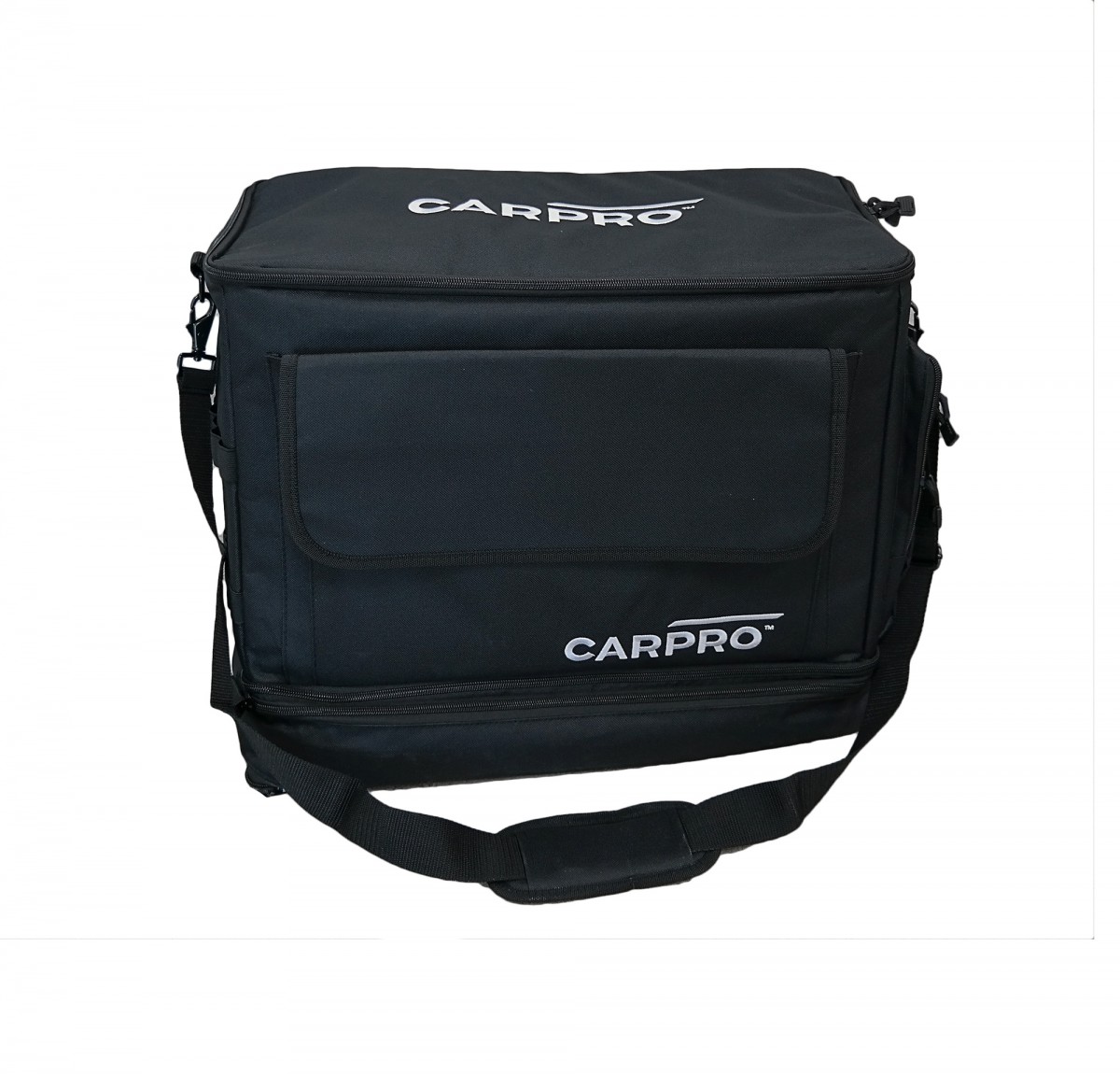 Detailingová taška, ktorá bola navrhnutá na ukladanie a prepravu CarPro prípravkov a na uloženie a rozčlenenie všetkej vašej základnej výbavy. Hlavná priehradka má 12 vreciek, ktoré pojmú až jednolitrové fľaše alebo pollitrové striekacie fľaše, má tiež priestor na uloženie utierky CarPro, keramických povlakov CQuartz, leštiacich kotúčov, maskovacie pásky a náhradných spúšťacích hlavíc alebo príslušenstva. Na vonkajšej strane nájdete elastické slučky pre kefy, dve veľké vrecká na príslušenstvo a jednu spodnú časť XL so zipsom, ktorá je ideálna na uteráky z mikrovlákna, aby boli chránené pred znečistením. Je vyrobená z ľahko čistiteľného syntetického materiálu Nylon, ktorý je odolný proti roztrhnutiu, so zosilneným ramenným popruhom, odolnými zipsami a gumovou základňou, ktorá zabraňuje kĺzaniu v batožinovom priestore vozidla.