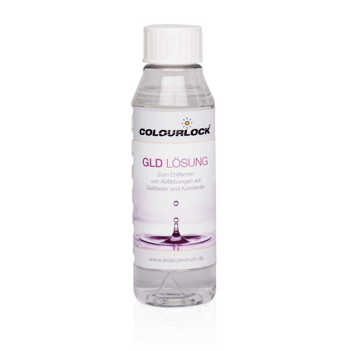 Prípravok určený na odstránenie silných zafarbeniu povrchu kože od atramentu, textilného alebo novinového farbivá. Použitie iba v prípadoch, keď už nemožno zafarbenie odstrániť bežnými čistiacimi prostriedkami (Lederreiniger Stark, Entfarber Stift). Prípravok možno taktiež použiť pre odstránenie vrchnej krycej vrstvy laku pred farbením kože.Návod na použitie rozpúšťadlá Colourlock GLD Lösung