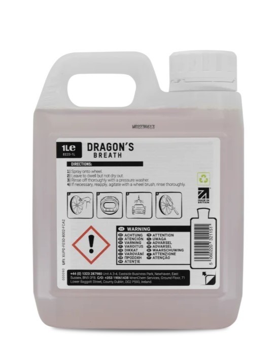 Už sám názov naznačuje, že pôjde o niečo špeciálne - v preklade "Dračí dych". Je to z toho dôvodu, že dosť zapácha a po chvíľke prípravok na kolesách alebo karosérii výrazne zružovie. Dragons Breath je pH neutrálny čistič kolies a veľmi efektívny odstraňovač vzdušnej hrdze. ValetPRO Dragons Breath skvele reaguje so železitým znečistením, ktoré nie je príliš vidieť, ale na karosérii a na kolesách je ho väčšinou veľa. Táto chemická reakcia dokáže meniť železo na vodorozpustný roztok. Dragon Breath je možné bezpečne používať aj na leštené kolesá.