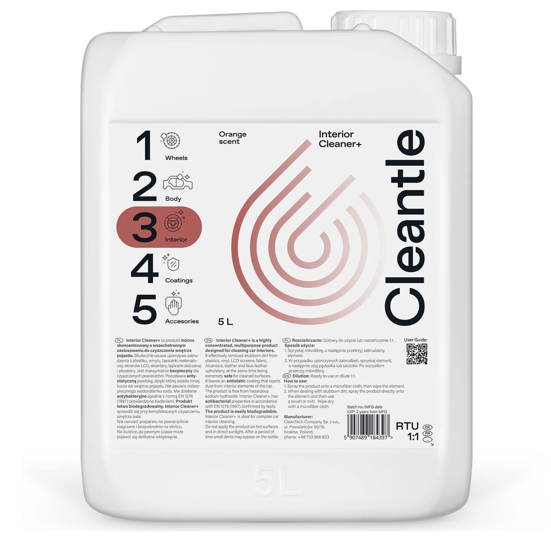 Vysoko koncentrovaný prípravok so všestranným využitím a revolučnou silou účinku. Je určený na použitie vo vnútri vozidla - zaisťuje maximálnu bezpečnosť povrchov a mimoriadnu účinnosť čistenia. Je bezpečný pre plastové a gumové prvky, látkové čalúnenie, ekokožu a LCD obrazovky. Cleantle Interior Cleaner+ má antibakteriálny účinok a zanecháva antistatický povlak. Má príjemnú a nedráždivú vôňu pomarančov.