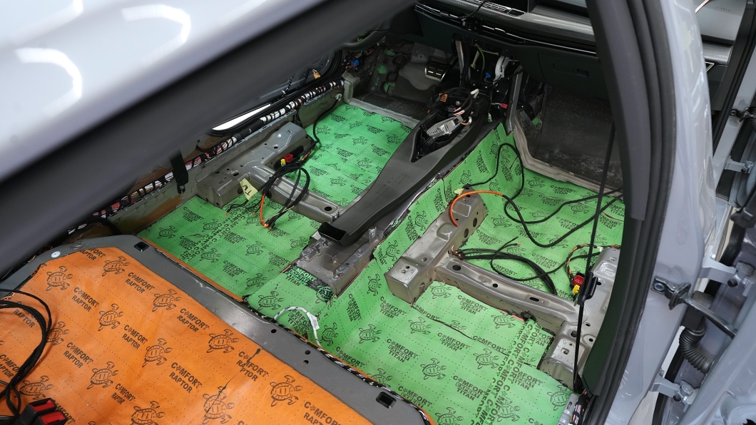 Typickým príkladom sú podlaha a zadné podbehy – najzaťažovanejšie a akusticky najproblematickejšie časti vozidla.Práve tu aplikujeme antivibračné materiály s hrúbkou 3 až 4 mm s vysokým stratovým činiteľom (MLF ≥ 0,49), čo znamená mimoriadne vysokú schopnosť premeniť vibrácie karosérie na teplo a zabrániť ich šíreniu do interiéru.V náročnejších a zároveň najžiadanejších inštaláciách potom používame Comfortmat Extreme s MLF 0,63, ktorý predstavuje dlhodobo najúčinnejší antivibračný materiál vo svojej kategórii.Naproti tomu napr. STP Black Gold, obvykle využívaný konkurenčnými spoločnosťami práve na podlahu a podbehy, disponuje hrúbkou 2 mm a MLF s hodnotou iba 0,35 – čo znamená o 45 % nižšiu účinnosť. Tento materiál je určený predovšetkým do dverí a ďalšej akusticky menej zaťaženej oblasti, na podlahe a podbehoch však stráca svoje schopnosti. A to jednoznačne spoznáte na účinku odhlučnenia.