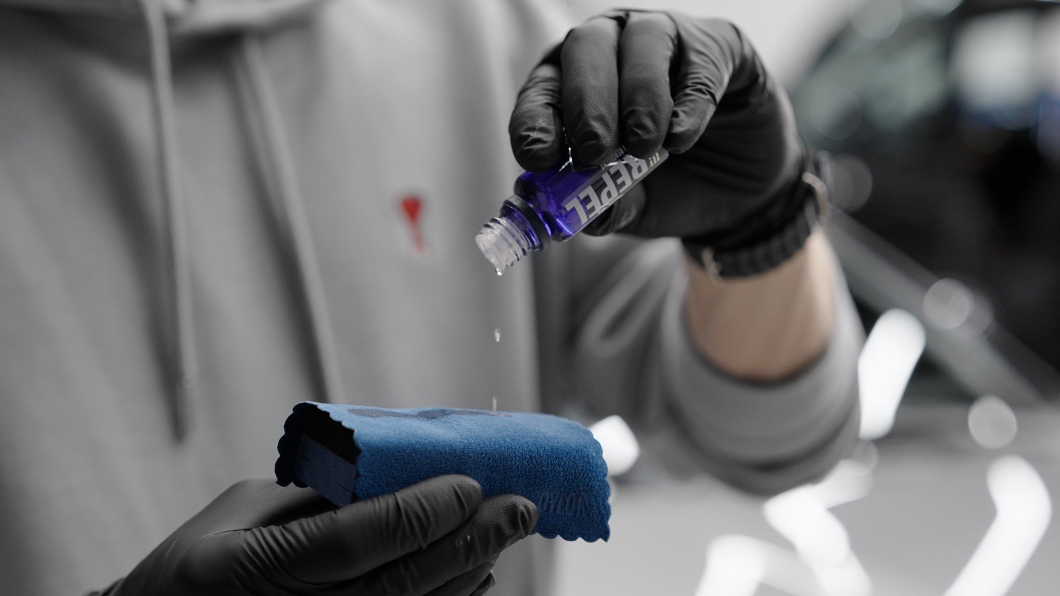 Po dôkladnej príprave skla prichádza samotná aplikácia keramickej ochrany. Pred začiatkom si nasaďte ochranné gumové rukavice, aby ste predišli kontaktu s pokožkou. Fľaštičku s keramickým povlakom zľahka pretrepte a nakvapkajte niekoľko kvapiek na priloženú aplikačnú hubku obalenú suede utierkou.