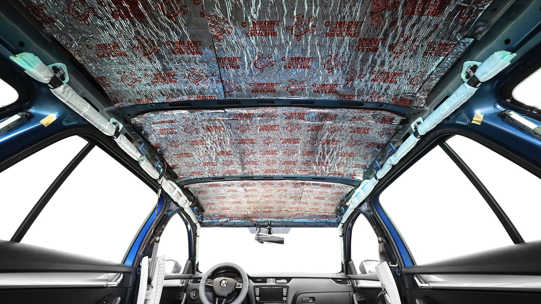 Odhlučnenie strechy patrí aj napriek veľmi zaujímavú účinnosť k menej žiadaným úkonom na našej dielni, napriek tomu si táto oblasť vozidla zaslúži vašu pozornosť. Odhlučnenie strechy poskytne hneď niekoľko zaujímavých benefitov, ktoré stoja za zmienku. Tým prvým je samozrejme zamedzenie hluku, ktorý cez strechu preniká do interiéru. Ide o aerodynamický hluk, hluk od vetra, ale tiež napríklad hluk pri jazde za dažďa, ktorý po odhlučnení takmer nepočujete. Ďalším špecifikom odhlučnenia strechy je tepelne izolačná funkcia. Prvú vrstvu odhlučnenia tvorí už tradične antivibračný materiál. Ten strechu spevní a zamedzí vibráciám a rezonanciám tejto oblasti. Zaistí tiež odstránenie plechového zvuku, ktorý počujete napríklad po klopaní na strechu zvonka. To má v praxi za následok elimináciu zvuku dažďových kvapiek, ktoré pri jazde za dažďa takmer nepočujete. Pre tieto účely najčastejšie volíme antivibračný materiál z radu Premium, konkrétne Comfortmat Dark D2 s hrúbkou 2,3 ​​mm. Dark D2 je momentálne najľahším antivibračným materiálom o tejto hrúbke súčasnosti, čo oceníte najmä pri odhlučnení stropu. Ako ďalšiu vrstvu volíme zvukovo izolačný materiál. Na výber máme z dvoch veľmi účinných variantov a je samozrejme na vás, aký zvolíte. My si popíšeme rovno ten najúčinnejší možný variant odhlučnenia strechy. Tým je zvukovo aj tepelnoizolačný materiál Comfortmat Skyline, ktorý je priamo určený pre odhlučnenie strechy vozidla. Zároveň ide o najľahší zvukovo izolačný materiál s protihlukovou membránou na svete s hmotnosťou 2,8 kg na 1 m². Aj vďaka tejto membráne poskytuje Skyline vysokú úroveň zvukovej izolácie až -25 dB. Okrem toho Skyline poskytuje aj tepelne izolačnú funkciu, čo oceníte najmä v lete. V horúcich dňoch sa cez strechu nedostane toľko tepla a v aute dlhšie vydržia chladnejšie teploty z klimatizácie. V zime je efekt opačný a ak máte odhlučnené celé auto materiálmi Comfortmat, z interiéru vozidla neuniká teplo. Ako tretiu vrstvu odporúčame aplikovať ešte polyuretánovú penu Comfortmat Soft Wave. Táto pena totiž dokáže pohltiť hluk, ktorý by bol schopný prekonať prvé dve vrstvy odhlučnenia a zároveň vyplní priestor medzi strechou a stropnicou. Vlnitý povrch zamedzí šíreniu hluku po rovnom povrchu strechy a pohltí aj ďalšie zvuky ako škrípaniu alebo chrasteniu stropnice, prípadne kabeláže osvetlenia, a pod. Soft Wave disponuje tvarovou pamäťou a je veľmi flexibilný. Aj napriek hrúbke 15 mm materiál môžete aplikovať takmer do všetkých priestorov, pretože sa dokáže stlačiť na iba jeden milimeter. Veľkou výhodou tohto materiálu je okrem excelentnej schopnosti absorbcie hluku aj jeho hmotnosť, ktorá je iba 0,6 kg na 1 m². Viac informácií nájdete v našom článku "ako odhlučniť strechu".
