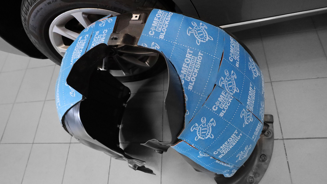 Odhlučnenie predných podbehov má veľký význam najmä v prípade, ak nedôjde k odhlučneniu podlahy vozidla. Ale aj vtedy má samozrejme nezanedbateľný efekt. Odhlučnenie predných podbehov dokáže účinne zmierniť prenikanie hluku do interiéru vozidla od predných kolies a cesty. Zároveň zamedzí hluku od lietajúcich kamienkov alebo zvuku tlmičov a je teda dôležitým prvkom pre celkové odhlučnenie vozidla. Predné a samozrejme aj zadné podbehy sú namáhané výraznými vibráciami, ktoré je najprv potrebné čo najviac eliminovať. Na túto oblasť je teda vhodné aplikovať účinnejší antivibračný materiál silnejšej hrúbky a preto volíme antivibračný materiál Comfortmat Dark D4 z modelového radu Premium. Ten disponuje hrúbkou 4 mm a už veľmi vysokým akustickým stratovým činiteľom (anglicky MLF - mechanical loss factor) s hodnotou 0,49. Materiál s takými parametrami dokáže už veľmi účinne zabrániť vibráciám aj efektu "zvonenia" v tejto časti karosérie. Na jeden podbeh bude potrebné cca 2,5 až 3 kusov antivibračného materiálu, na oba podbehy teda 5 až 6 kusov podľa veľkosti auta. Najdôležitejšie je aplikovať materiál najmä na časti najbližšie ku kabíne vozidla, môžete však v ideálnom prípade antivibračným materiálom vytlmiť celý podbeh. Materiál však z estetických dôvodov neaplikujeme na viditeľné miesta, ktoré nezakrýva plastový podbeh. Z karosérie sa presúvame na plastové podbehy a dostávame sa k samotnému odhlučneniu podbehov. Na odhlučnenie predných podbehov používame prémiový zvukovo izolačný materiál Comfortmat Blockshot, ktorý sa skladá z dvoch vrstiev a jeho celková hrúbka 7 mm. Blockshot je unikátny membránový materiál, ktorý aj vďaka svojej protihlukovej membráne poskytuje vysokú úroveň zvukovej izolácie - 31 dB. Blockshot je úplne vodeodolný, nenasáva vodu ani vlhkosť, nehnije a nerozkladá sa. Plastový podbeh nielen dôkladne odhluční, ale aj spevní a zamedzí hluku od vozovky a to vrátane odchádzajúcich kamienkov. Nie je teda potrebné aplikovať na plastové podbehy ako prvú vrstvu antivibračný materiál, pretože Blockshot v rámci odhlučnenia plastových podbehov s prehľadom zastúpi aj jeho funkciu. Pred aplikáciou materiálu plastový podbeh dôkladne vyčistite a odmastite. Následne na jeden podbeh nalepte 2 až 3 kusy materiálu podľa veľkosti podbehu a snažte sa pokryť čo možno najväčšiu plochu. Na oba predné podbehy bude teda potreba najčastejšie 5 až 6 kusov materiálu Comfortmat Blockshot. Viac informácií sa dozviete v našom článku "ako odhlučniť predné podbehy".