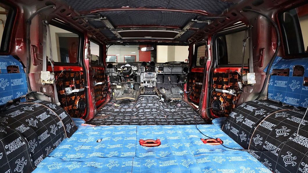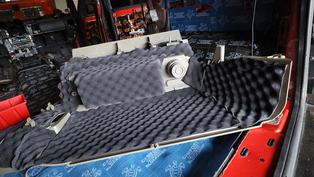 Na antivibračný materiál ako druhú vrstvu spravidla aplikujeme zvukovo izolačný, ak chcete protihlukový materiál. Ten má za úlohu zamedziť prenikaniu okolitého hluku do interiéru vozidla. Prakticky na každú oblasť vozidlá používame iný zvukovo izolačný materiál, pretože každá plocha vozidla má iné vlastnosti aj zaťaženie hlukom. Do niektorých častí vozidla aplikujeme dve vrstvy zvukovo izolačných materiálov a do iných si vystačíme s jednou. Prvý variant, teda aplikácia dvoch vrstiev zvukovo izolačných materiálov (s antivibračným materiálom ide celkovo o tri vrstvy), sa týka podlahy a zadných podbehov. Sú to oblasti s najvyšším zaťažením vibráciami a hlukom na celom vozidle a preto je nutné sa im náležite venovať. Ako druhú vrstvu teda aplikujeme zvukovo aj tepelnoizolačný materiál Comfortmat Vision, ktorý má schopnosť zvukovej izolácie cca -15 dB. Na ten však bude aplikovaná ešte tretia vrstva, o ktorej sa dozviete viac v ďalšej kapitole. Na dno a bočné strany batožinového priestoru aplikujeme iba druhú vrstvu v podobe materiálu Comfortmat Blockshot. Tento viacvrstvový materiál obsahuje okrem zvukovo a teplne izolačnej vrstvy tiež protihlukovú membránu o sile 1,5 mm, ktorá účinne zamedzí prenikaniu hluku do interiéru vozidla. Blockshot poskytuje vysokú úroveň zvukovej izolácie až -31 dB, čo je na tieto oblasti dostačujúce. Ostatné časti vozidla si opäť rozobereme v daších kapitolách tohto článku.