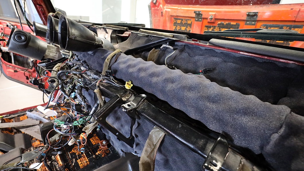 Medzi najväčšie problémy tohto vozidla patrila aj vŕzgajúca palubná doska a preto sme sa pustili aj do odhlučnenia tejto časti vozidla. Nutné povedať, že ide s prehľadom o najnáročnejšiu časť odhlučnenia ľubovoľného vozidla a je to jeden z dôvodov, prečo sa u nás palubné dosky zvyčajne neodhlučňujú. Demontáž a opätovná montáž je zložitá a zaberie niekoľko hodín času trom technikom zároveň. Určite si viete predstaviť koľko skrutiek, káblov a najrôznejších častí a úchytov je nutné s maximálnou starostlivosťou demontovať, než sa kompletne celá palubná doska demontuje. A o opätovnom zložení nehovoriac, to je ešte náročnejšie a sú nevyhnutné mnohoročné skúsenosti, zručnosť a trpezlivosť. Čo sa týka samotného odhlučnenia, tak na všetky plastové diely palubnej dosky aj jej vnútorná časť sme aplikovali protihlukovú penu Comfortmat Soft Wave, ktorá zamedzí škrípanie a vŕzganie plastov a zároveň má vysokú schopnosť zvukovej izolácie a dokáže do seba absorbovať nemalú časť hluku z motorovej časti vozidla . Plochy plastových dielov, ktoré sa o seba dotýkajú, sme navyše oblepili tesniacou páskou Comfortmat Bitosoft AntiCreak. Vďaka demontáži palubnej dosky sme sa dostali aj k veľkej časti priečky medzi motorovou časťou a interiérom, ktorú sme samozrejme tiež dôkladne odhlučnili. Odhlučnenie palubnej dosky teda nemá vplyv len na škrípajúce plasty, ale dôležitá je aj možnosť ľahšej aplikácie antivibračných a zvukovo izolačných materiálov do priestoru medzi motorom a kabínou.