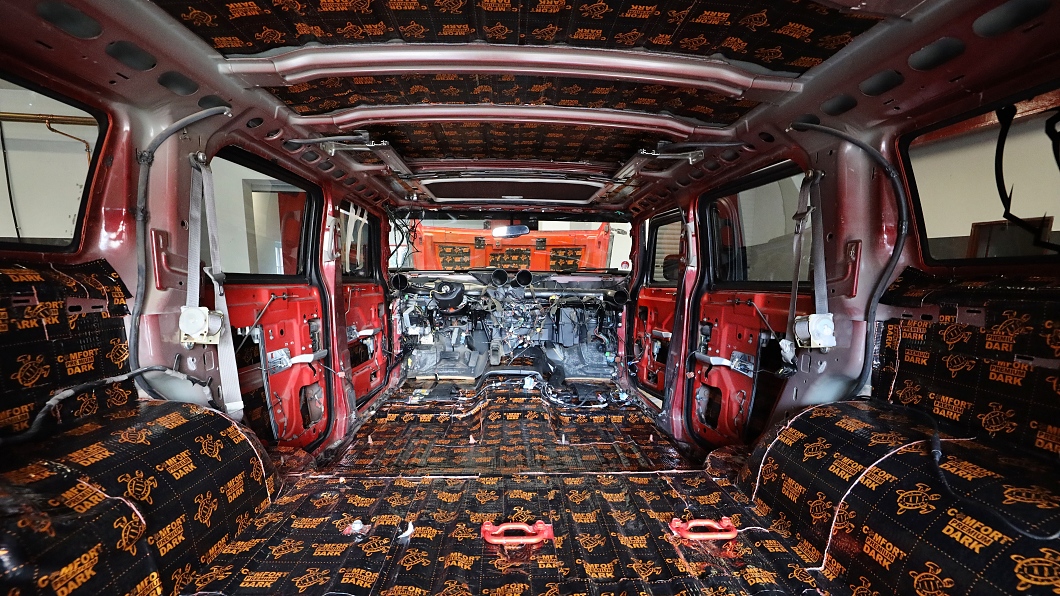 Hummer H2 je civilnou verziou pôvodne armádneho vozidla, ktoré sa vďaka svojim špecifickým vlastnostiam stalo najmä v USA veľkým hitom svojej doby. Medzi najväčšie nedostatky vozidla patrí vysoká hladina hluku v interiéri a veľký problém prestavuje aj nepríjemné vŕzganie všetkých interiérových plastov, ktoré sa pripomenú po prejdení akejkoľvek nerovnosti. Tento voz bol teda kompletne celý odhlučnený, konkrétne podlaha, batožinový priestor, strecha, všetky dvere, kapota a podbehy. Veľký dôraz bol kladený aj na všetky plasty interiéru, vrátane palubnej dosky. Ako sami môžete vidieť na nižšie uvedenej fotke, tak Hummer nemá vôbec žiadne továrenské odhlučnenie a pod tenkou vrstvou kobercov sa nachádza rovno holý plech. Od vozidla s takým motorom, hlasnými ladenými výfukmi a obrovskými kolesami nemožno čakať nič iné ako poriadny rámus v interiéri. Neľakajte sa inej farby laku vozidla, tento Hummer je opatrený čiernou matnou wrap fóliou.