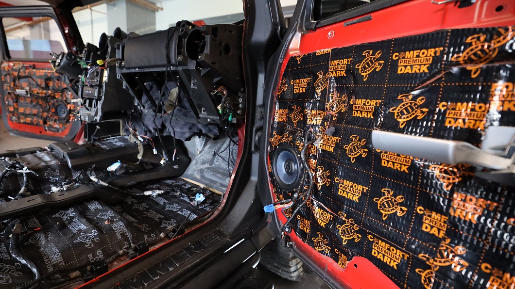 Prvou fázou odhlučnenia každého vozidla je aplikácia antivibračného materiálu, ktorého použitie má u tohto vozidla enormný význam. Výkonný osemvalec, ladené športové výfuky a široké kolesá dokážu celú karosériu poriadne rozvibrovať. A práve antivibračný materiál dokáže vibrácie a rezonancie veľmi účinne potlačiť. Najprv je nutné celú karosériu dôkladne vyčistiť a odmastiť. Následne na podlahu vozňa a celý batožinový priestor, vrátane zadných podbehov, sme aplikovali ako prvú vrstvu vysoko účinný antivibračný materiál Comfortmat Dark D4 z modelového radu Premium. Materiál disponuje hrúbkou 4 mm a akustickým stratovým činiteľom (MLF) s hodnotou 0,49 jednotiek. Ak nám dovolíte trochu teórie, tak akustický stratový činiteľ (anglicky mechanical loss factor) vyjadruje schopnosť materiálu pohlcovať šíriaci sa zvuk a meniť energiu vytvorených vibrácií na energiu tepelnú. Teoretický maximálny stratový činiteľ je 1, čo znamená žiadne vibrácie. Platí teda, že čím vyššia je stratový činiteľ, tým lepšie. Totožný materiál sme použili aj na predné podbehy. Na ostatné časti vozidla ako sú dvere, strop alebo kapota sme aplikovali o milimeter tenší antivibračný materiál Comfortmat Dark D3 s hrúbkou 3 mm a MLF 0,41 jednotiek. Týmto oblastiam sa však budeme venovať v ďalších kapitolách tohto článku.